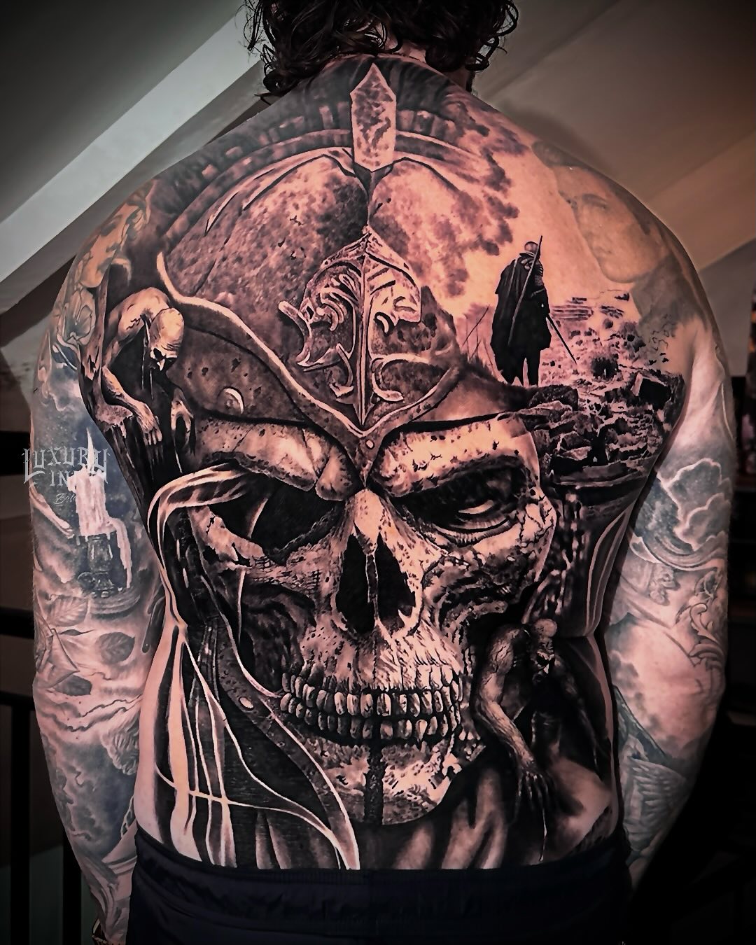 The tattoo features a prominent skull at the center, surrounded by intricate warrior elements and dark shading.
