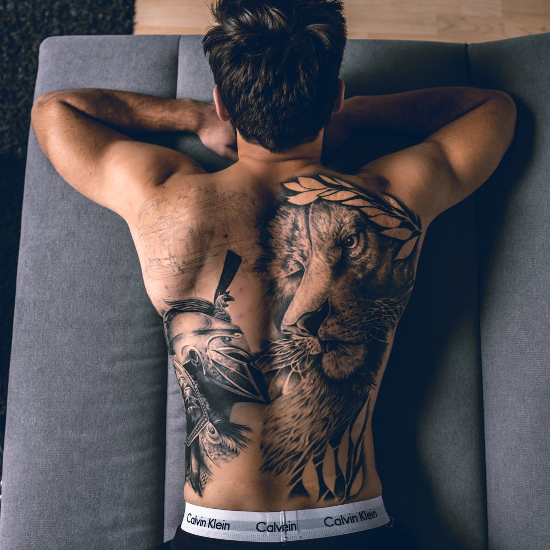 The tattoo features a striking lion’s face alongside a detailed depiction of a warrior’s helmet.
