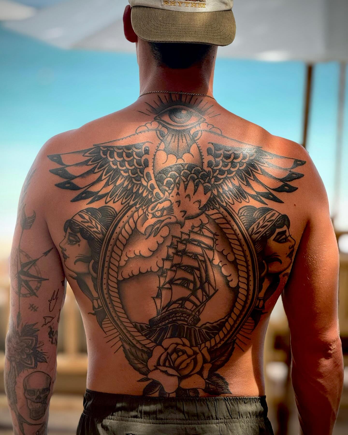 This back tattoo features a large eagle soaring above a ship surrounded by intricate details.