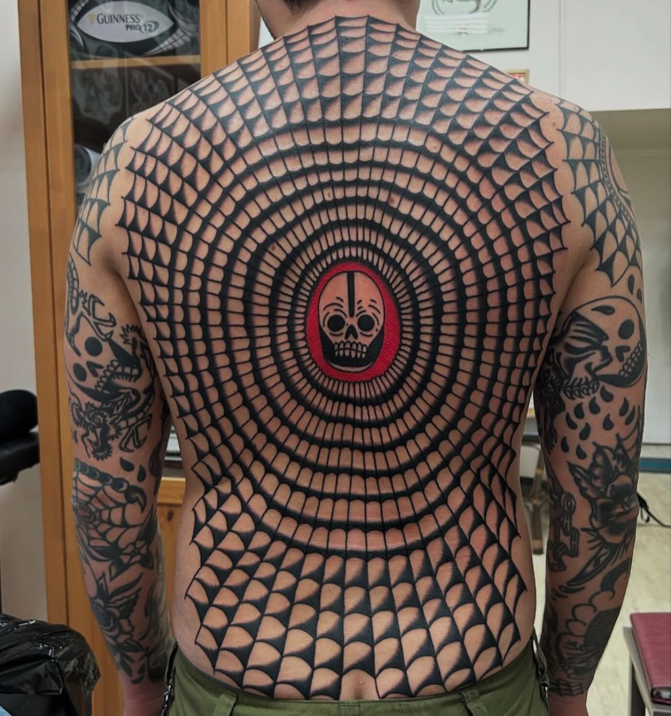 The tattoo features a striking geometric pattern that creates a sense of depth, drawing the eye toward the central skull.