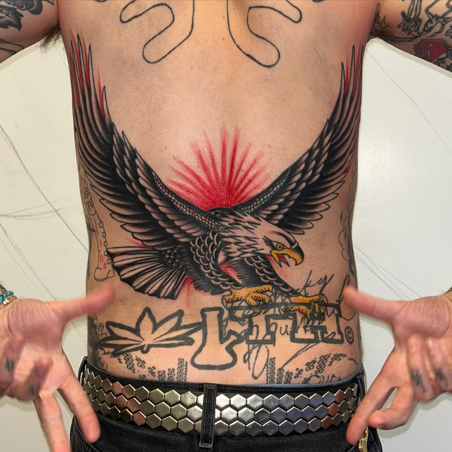 The tattoo features a striking eagle with outstretched wings, accented by vibrant red rays that create a dramatic backdrop.