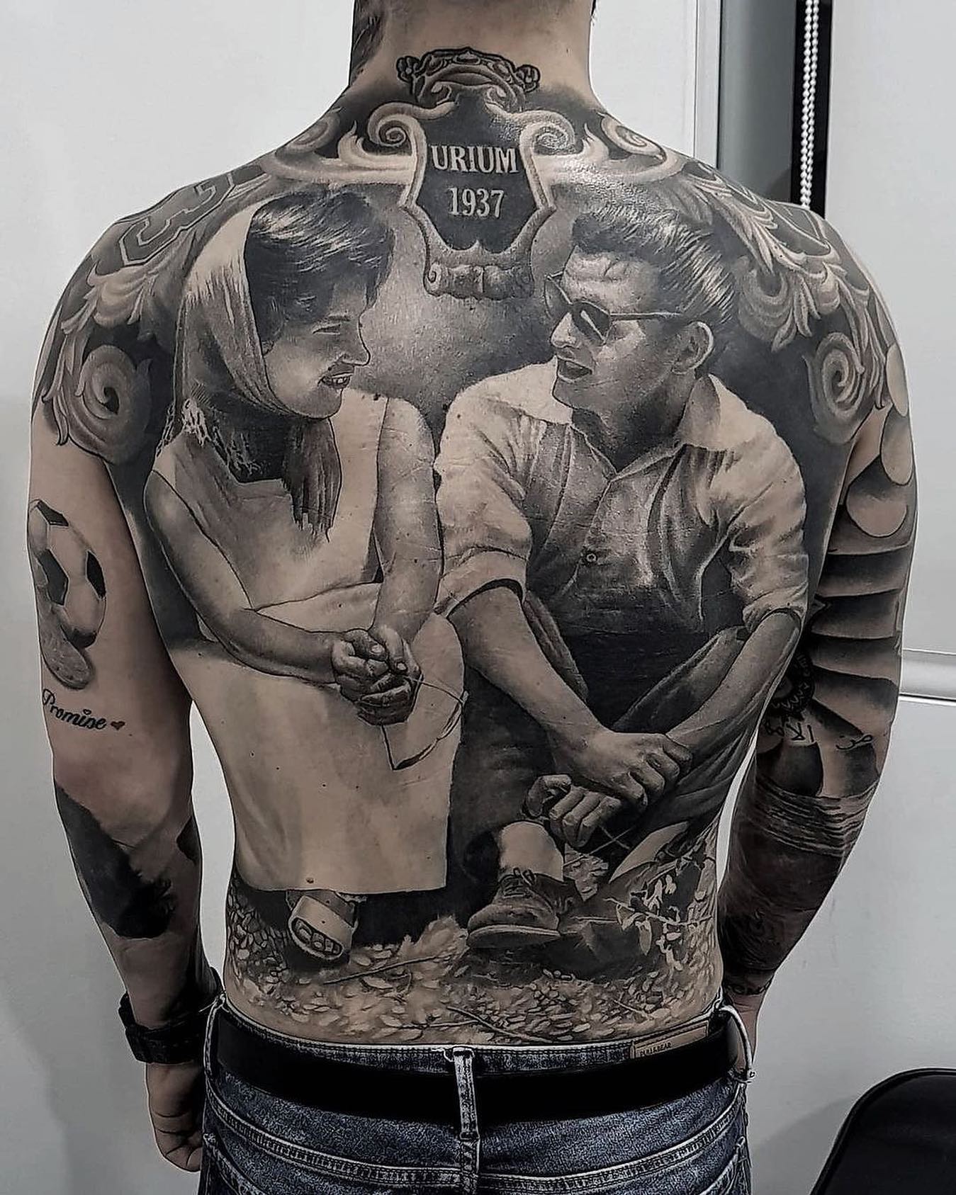 The back tattoo features a detailed portrait of a couple engaged in a tender moment, showcasing their connection through body language.