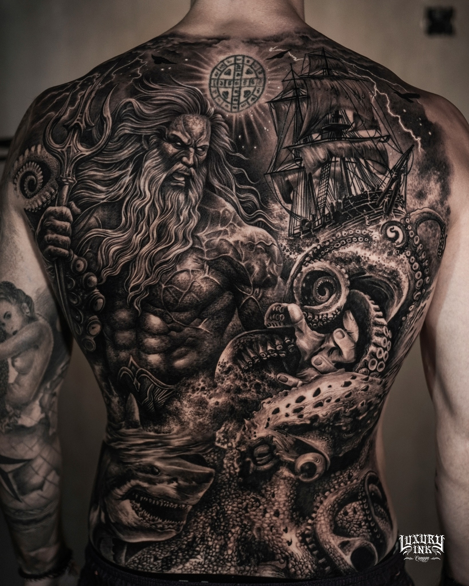 The tattoo features a powerful figure resembling a sea god, complete with a trident and flowing beard, surrounded by dynamic ocean imagery.
