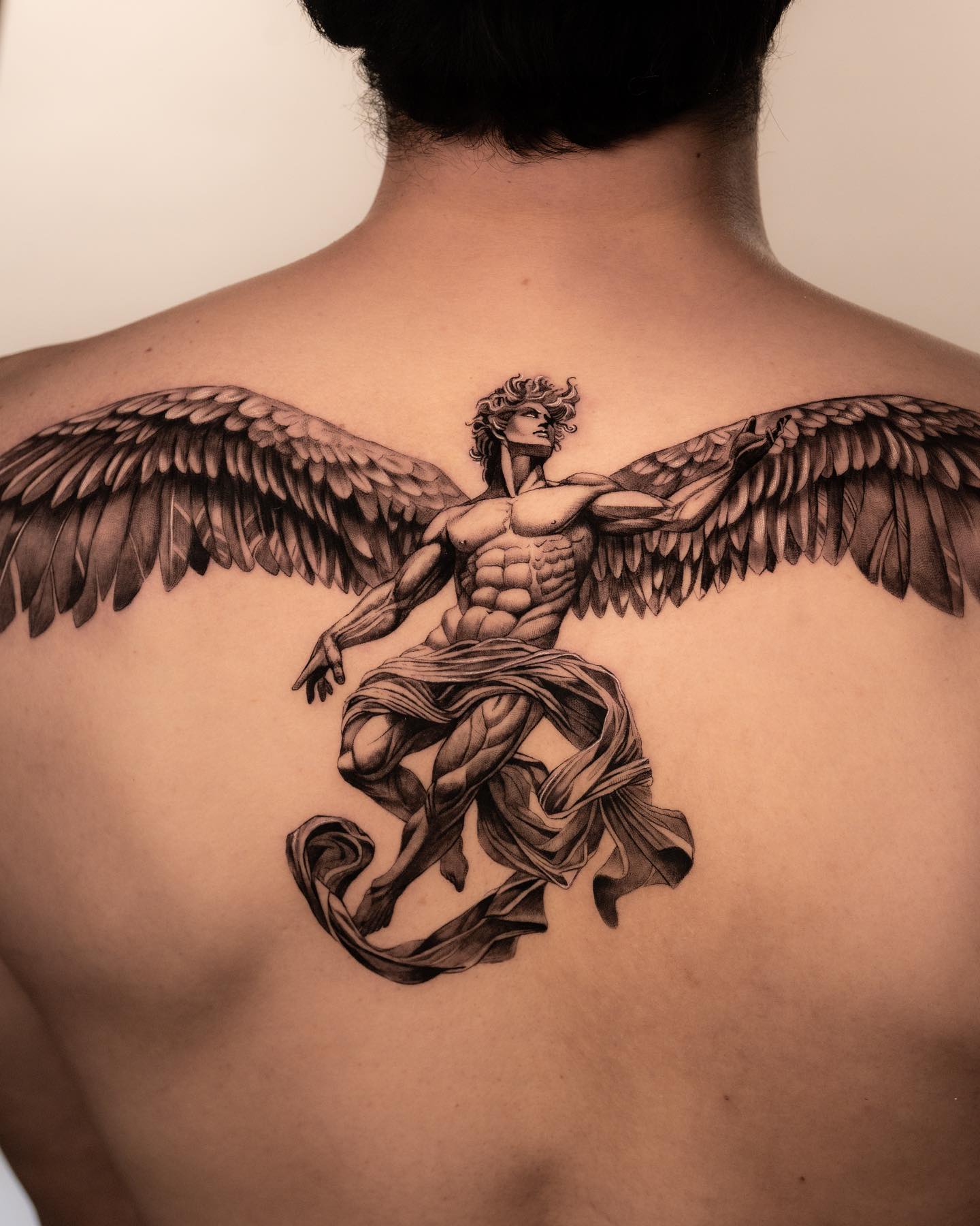The tattoo features a dynamic winged figure that showcases impressive muscular detail and flowing fabric.