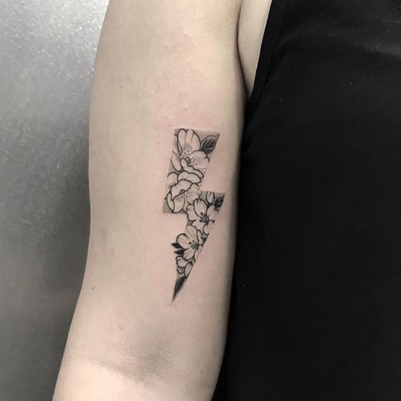 This unique tattoo beautifully blends a lightning bolt with delicate floral patterns, creating a striking visual contrast. The combination of sharp lines and soft blooms makes this design stand out, showcasing both strength and grace. When choosing a tattoo, consider how different elements can represent different aspects of your personality.