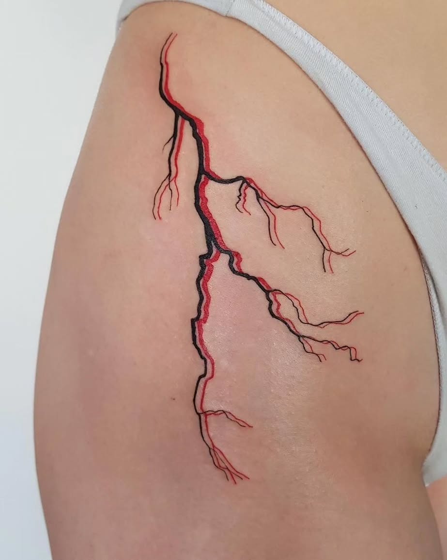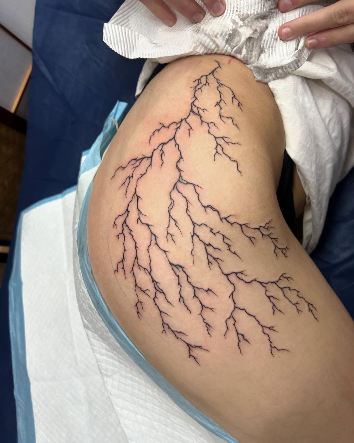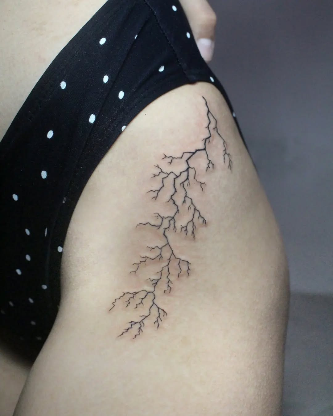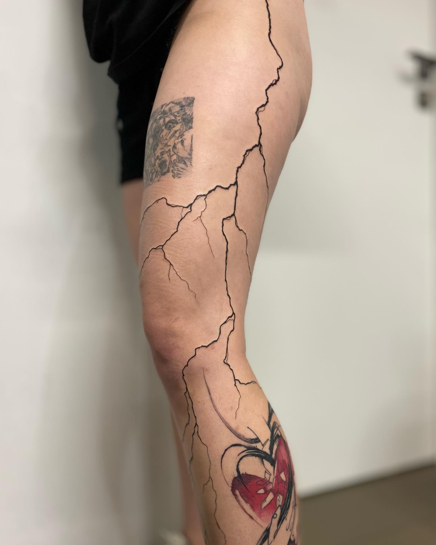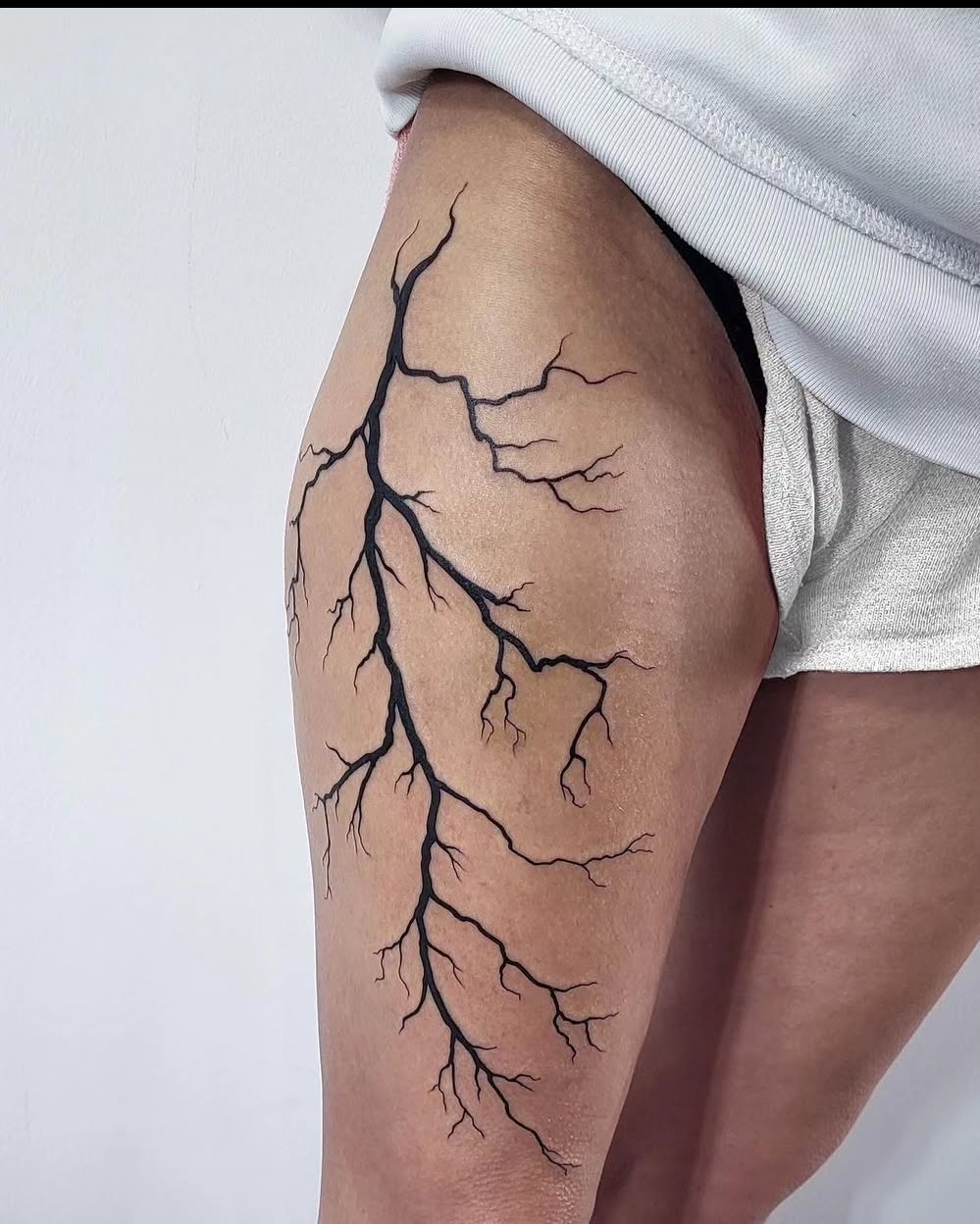 This striking tattoo showcases a stunning lightning bolt design that flows gracefully along the thigh. The intricate branching pattern not only adds depth but also symbolizes power and energy. For those considering a lightning bolt tattoo, choosing a placement that highlights its dynamic nature can enhance its impact.