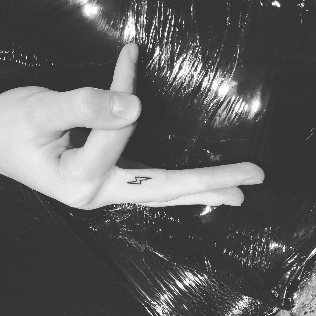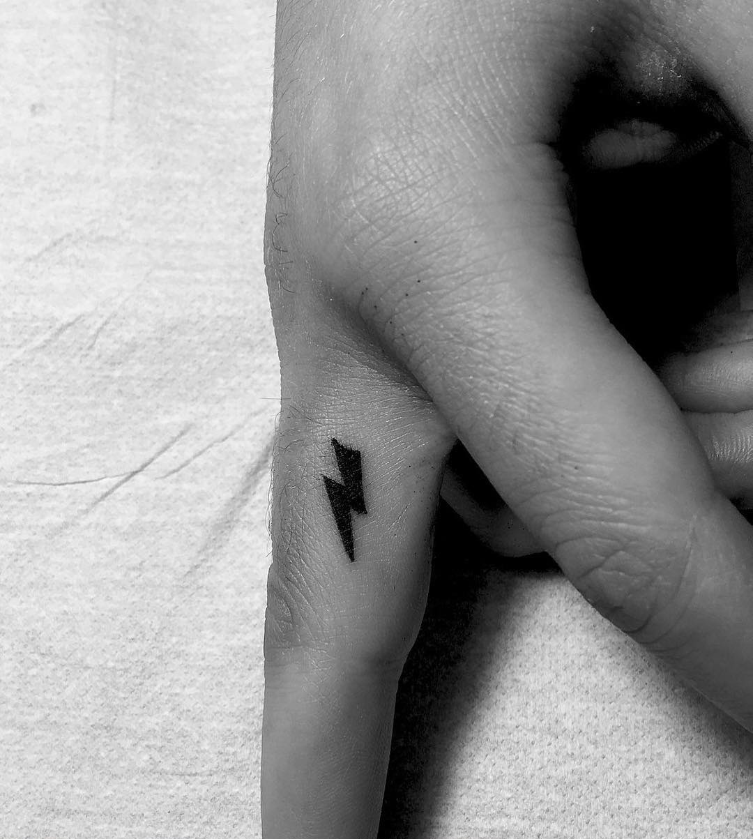 This image showcases a sleek lightning bolt tattoo on a finger, making a bold statement with its simple yet eye-catching design. The contrast of the dark ink against the skin draws attention and highlights the unique placement, perfect for those who appreciate subtlety with a hint of flair. For anyone considering a lightning bolt tattoo, opting for a small and refined design can add a touch of elegance to their style.
