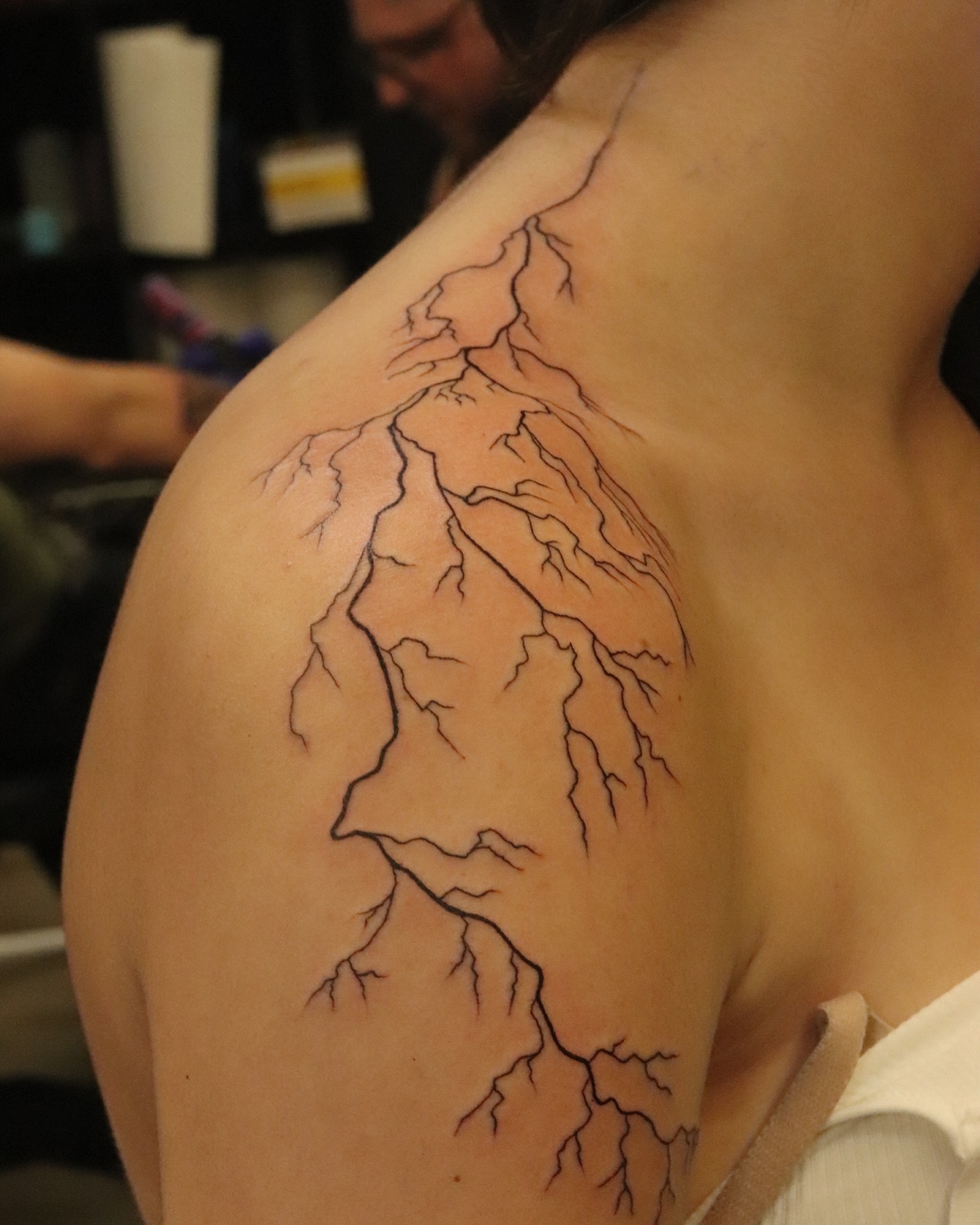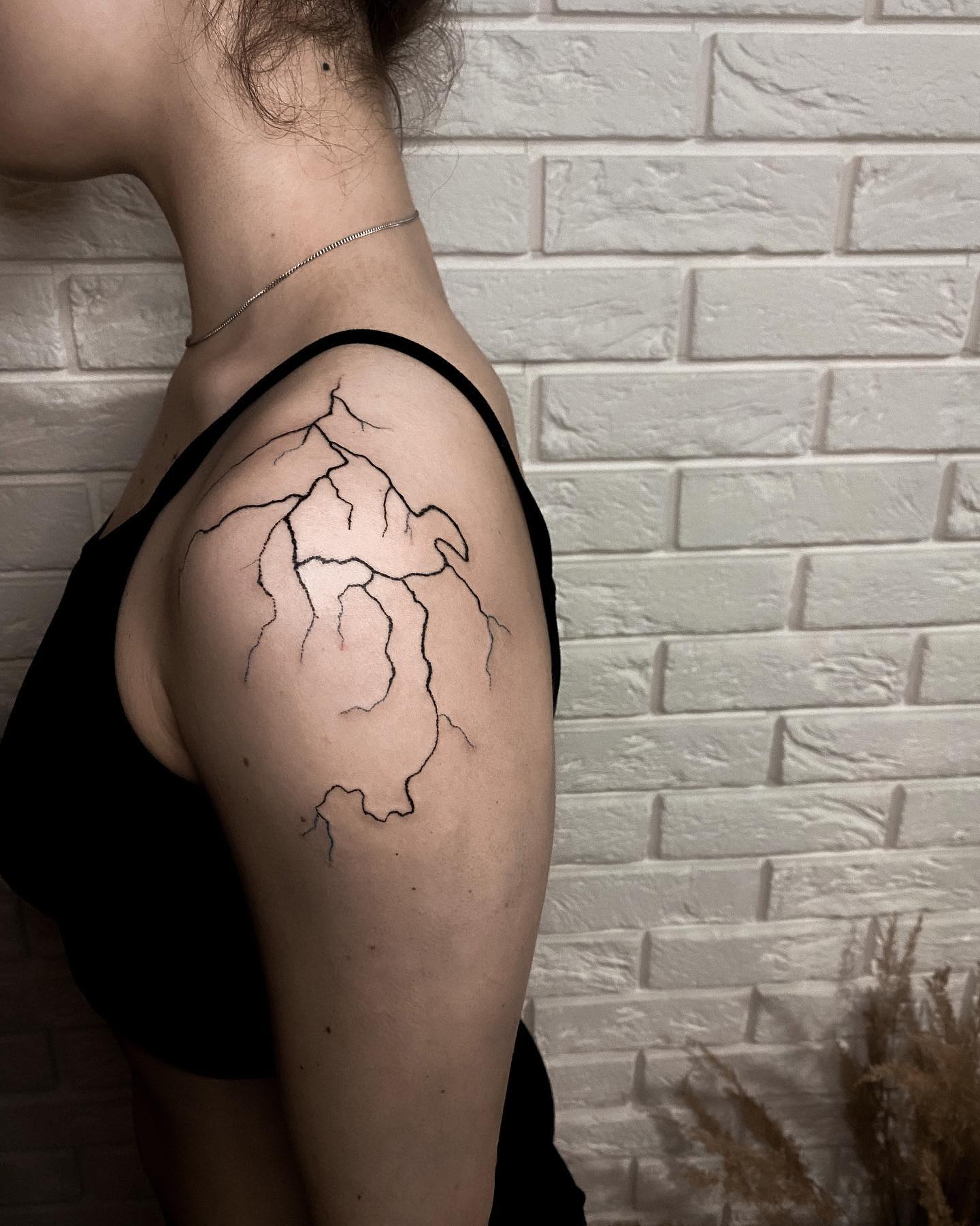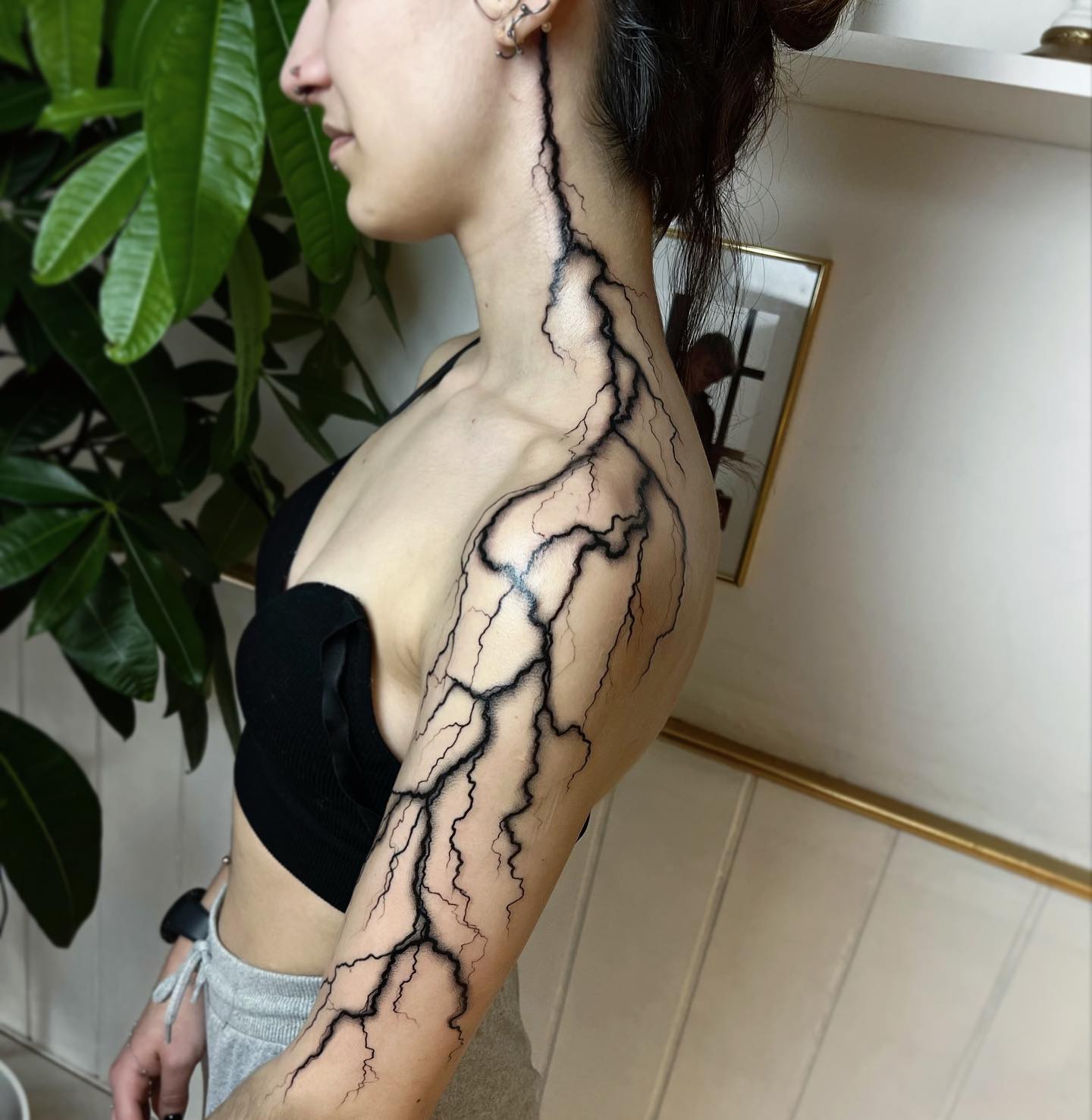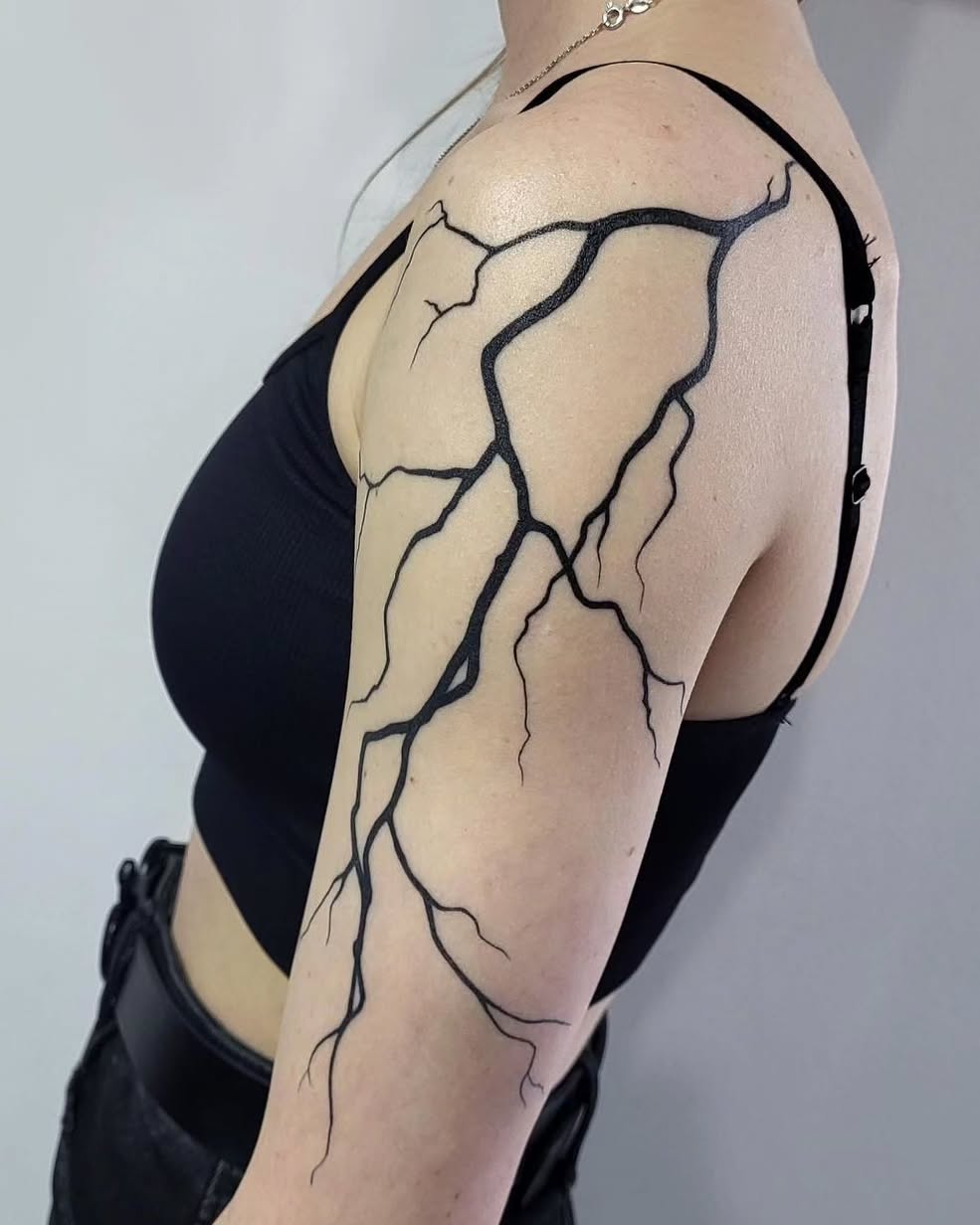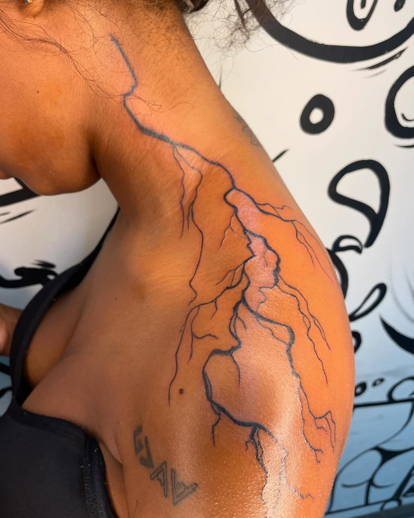 This tattoo showcases a striking lightning bolt pattern that flows elegantly along the shoulder. The intricate lines create a sense of movement, reminiscent of nature’s powerful forces. For those considering a lightning bolt tattoo, think about how it reflects your personality and style it’s a bold statement that can be uniquely yours.