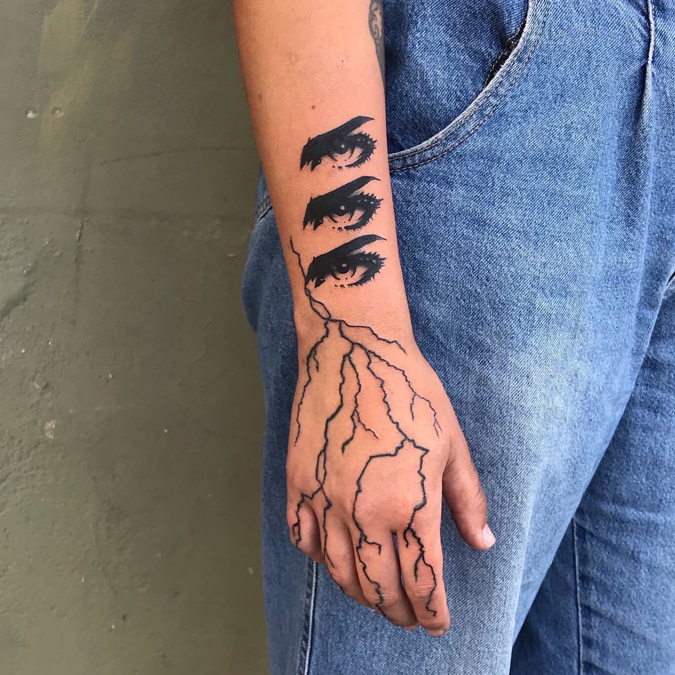 This tattoo design showcases an intriguing blend of eyes and lightning bolts, creating a striking visual effect. The way the lightning seems to connect the eyes adds a unique flair, making it both captivating and thought-provoking. For those considering a similar design, think about how personal symbols can add depth to any tattoo.