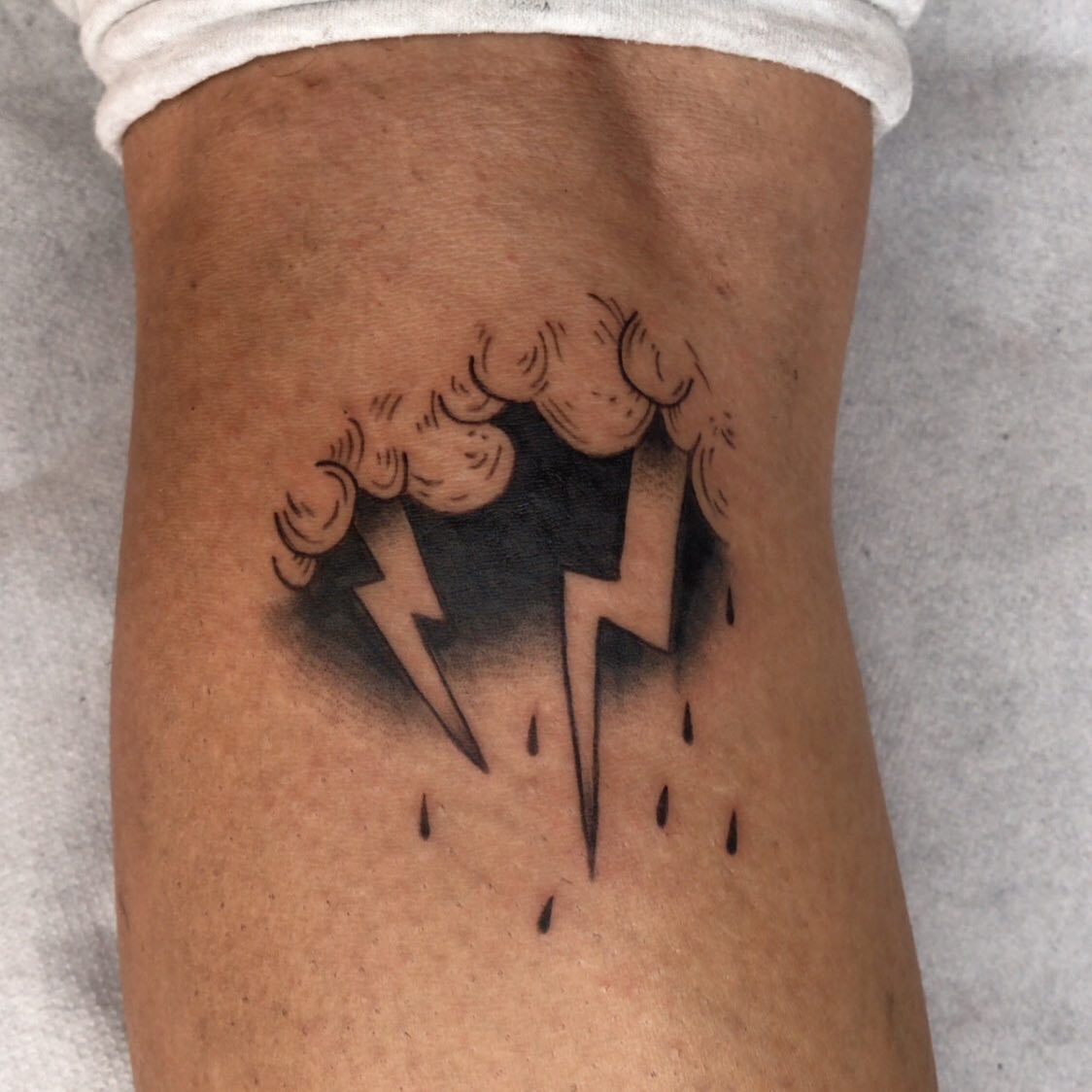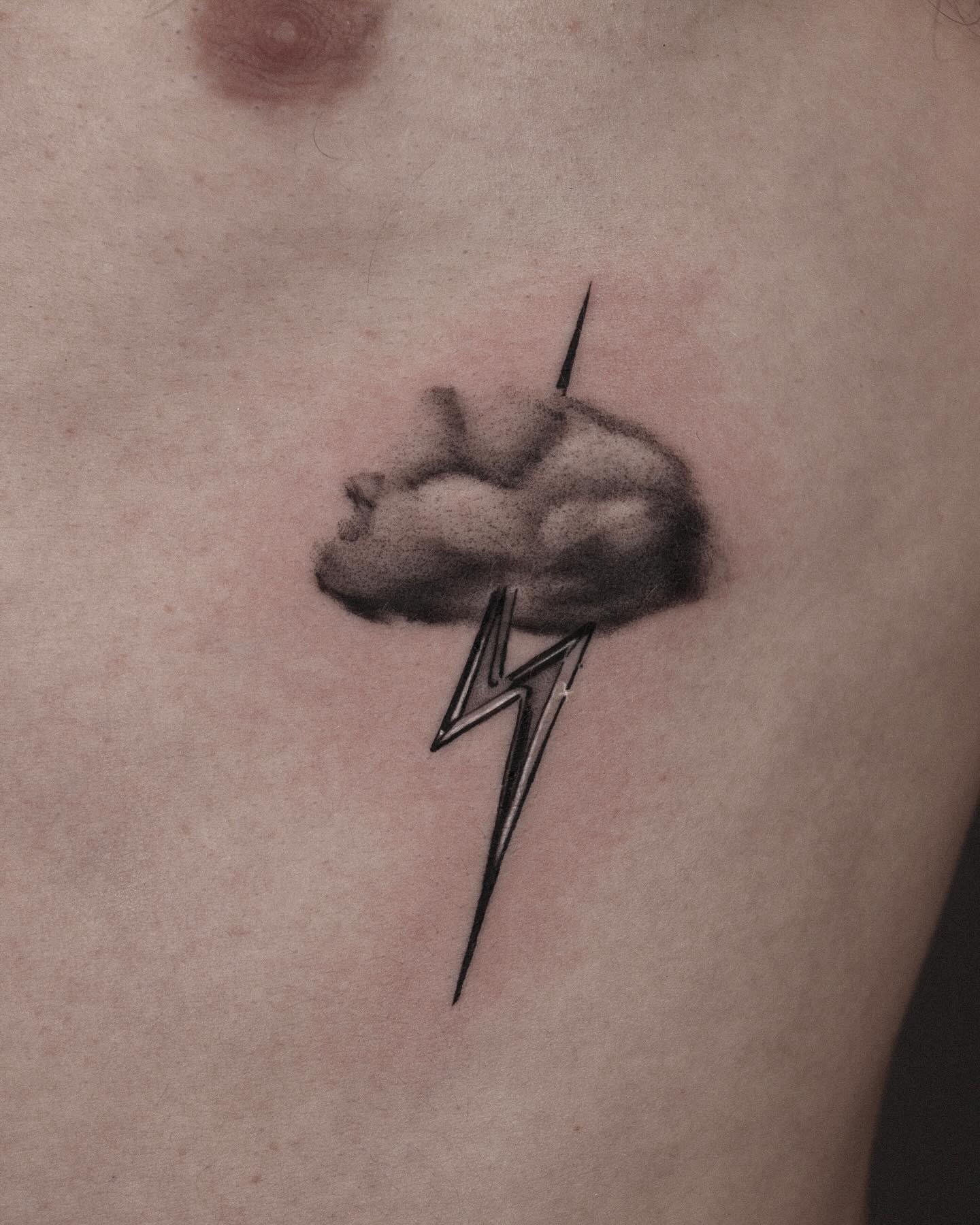 This stunning tattoo beautifully blends a soft, shaded cloud with a sharp lightning bolt, creating an eye-catching contrast. The design captures the raw power of nature while maintaining an artistic elegance that draws the eye. For those considering a similar design, think about how the elements can represent personal experiences or emotions, making the tattoo even more meaningful.