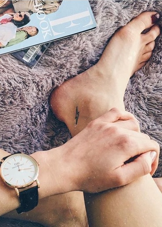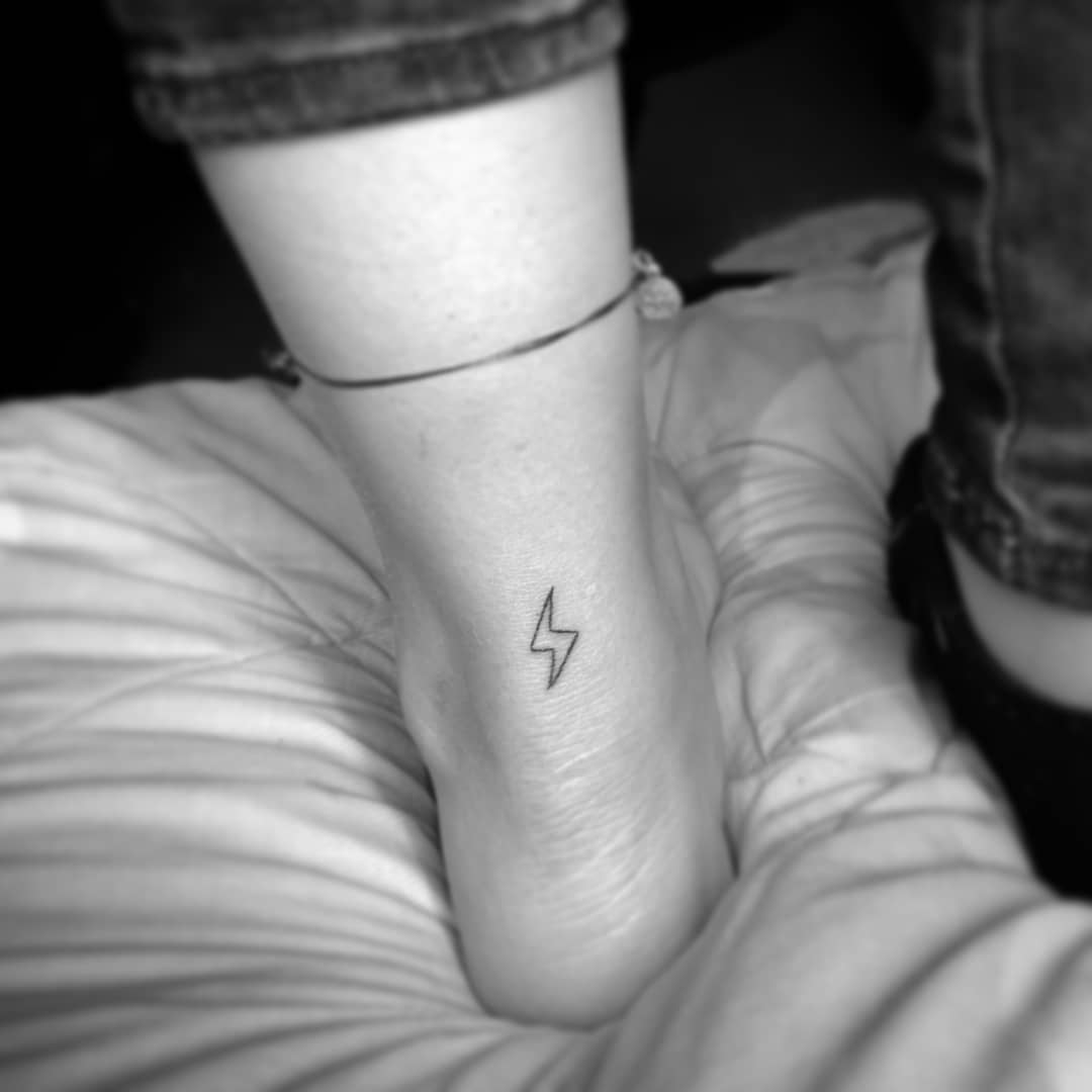 This image showcases a striking lightning bolt tattoo located on the ankle, perfectly blending simplicity with boldness. The clean lines and minimalist design highlight the tattoo s charm, making it a great choice for anyone wanting a subtle yet impactful piece of art. Choosing a small tattoo like this can be a fantastic way to express one s personality without overwhelming the skin.