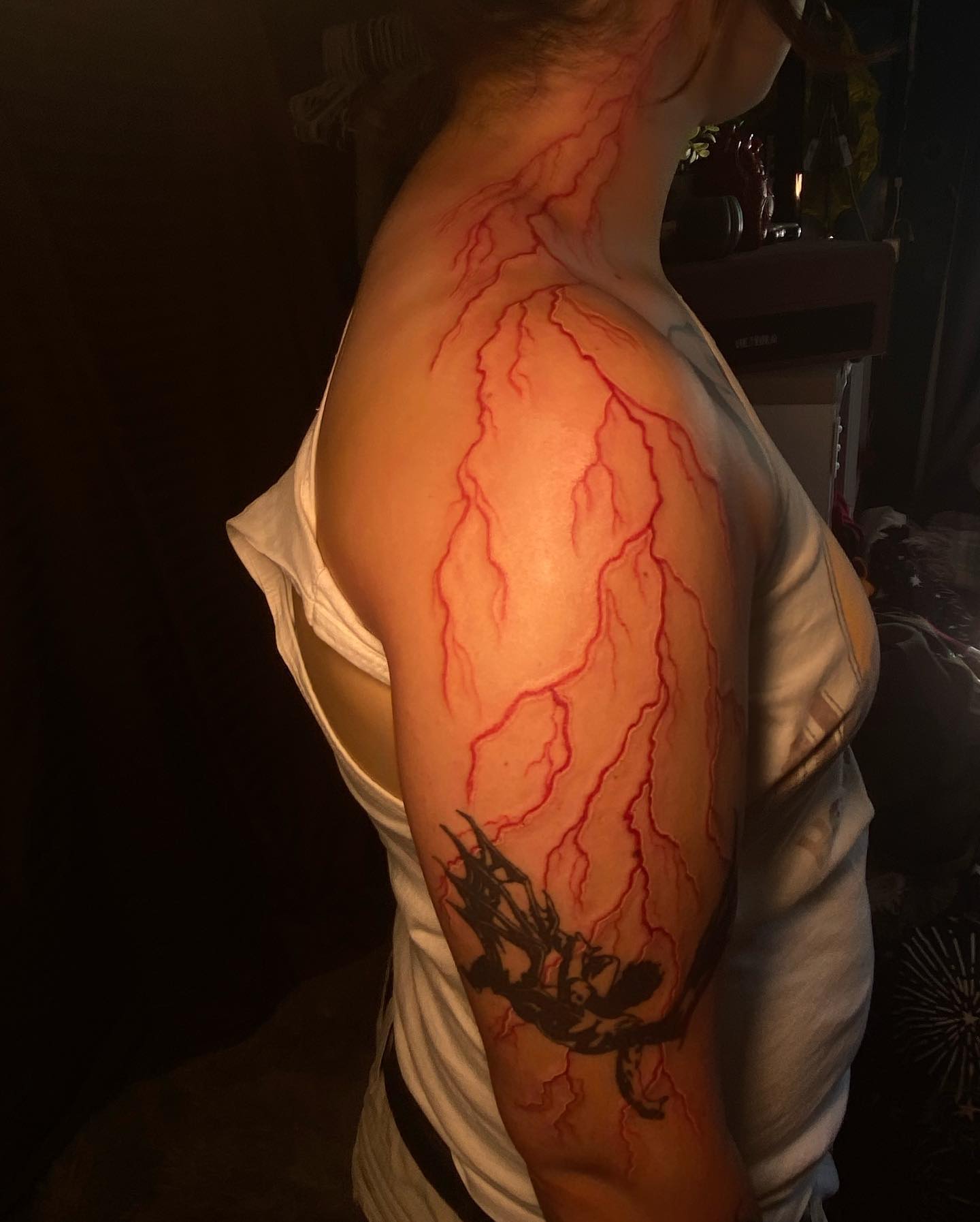 This stunning tattoo showcases a bold lightning bolt design that gracefully flows along the shoulder. The intricate details and vibrant colors create a striking effect, making it a true statement piece. For those considering similar tattoos, think about how the design can reflect your personality and style.