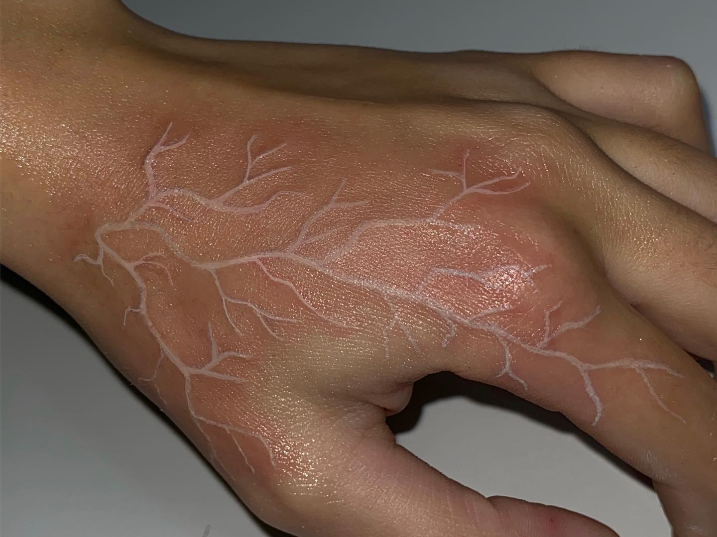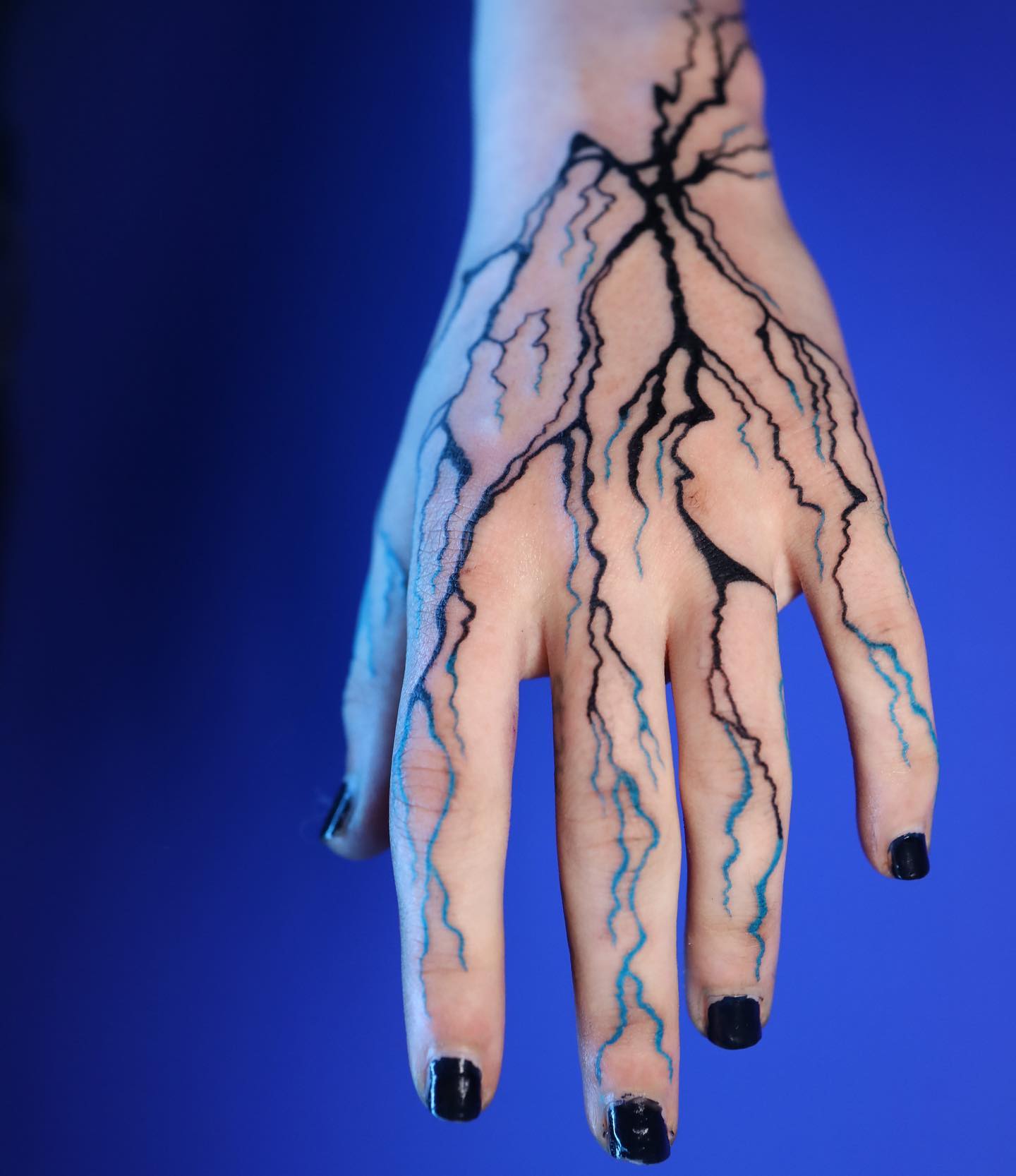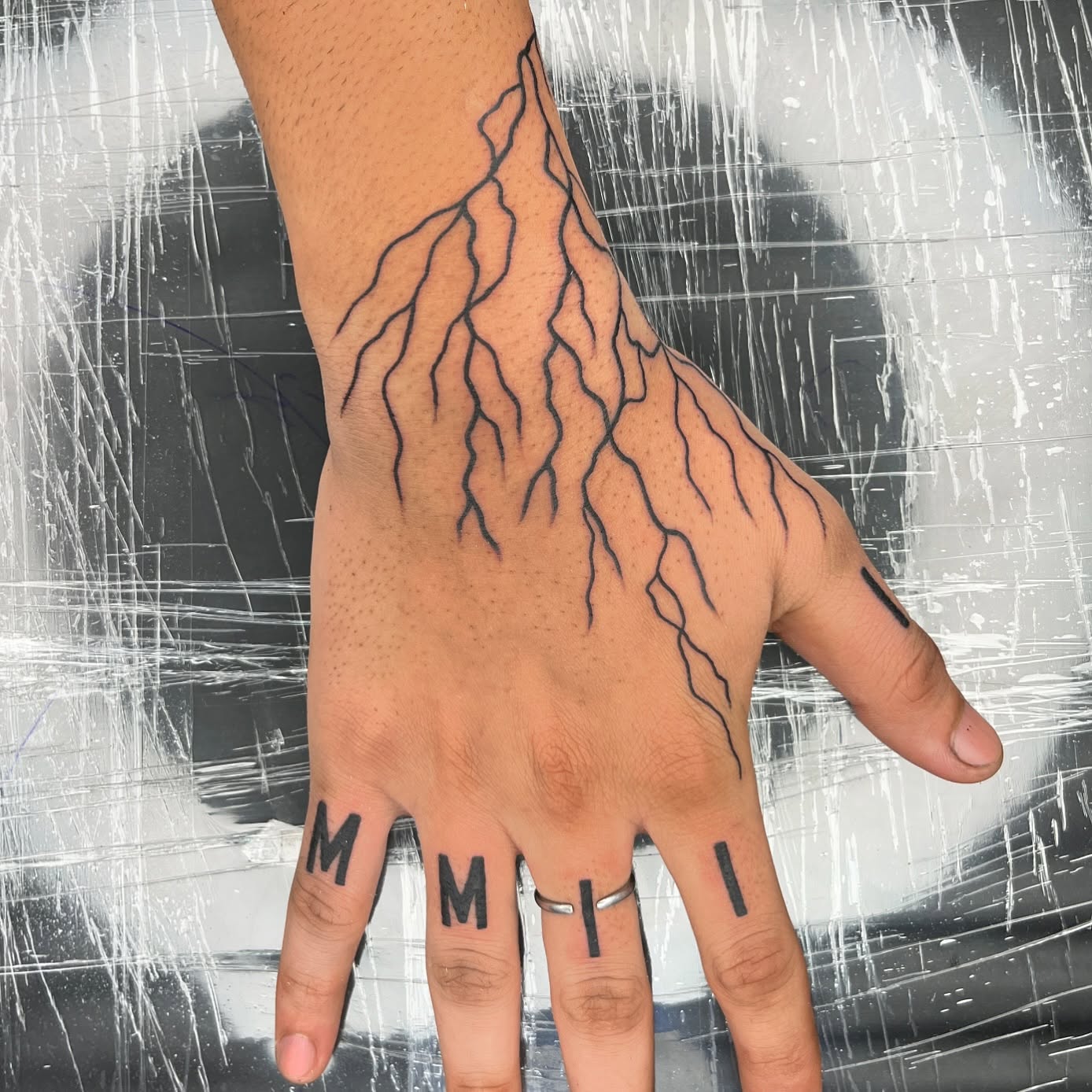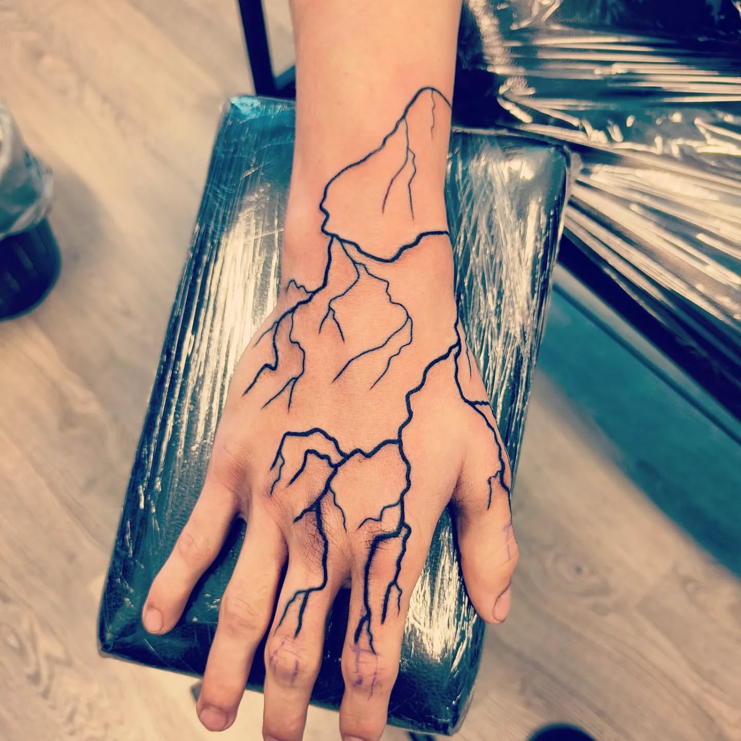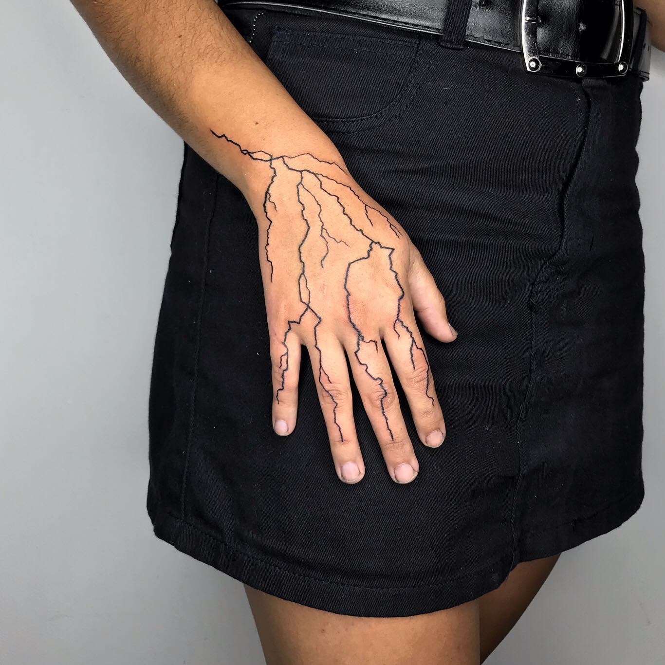 This striking image showcases a unique lightning bolt tattoo that flows gracefully across the hand. The delicate lines resemble natural lightning, creating an eye-catching effect that draws the viewer in. When considering a lightning bolt tattoo, think about how the design can reflect your personal story or energy, making it truly one-of-a-kind.
