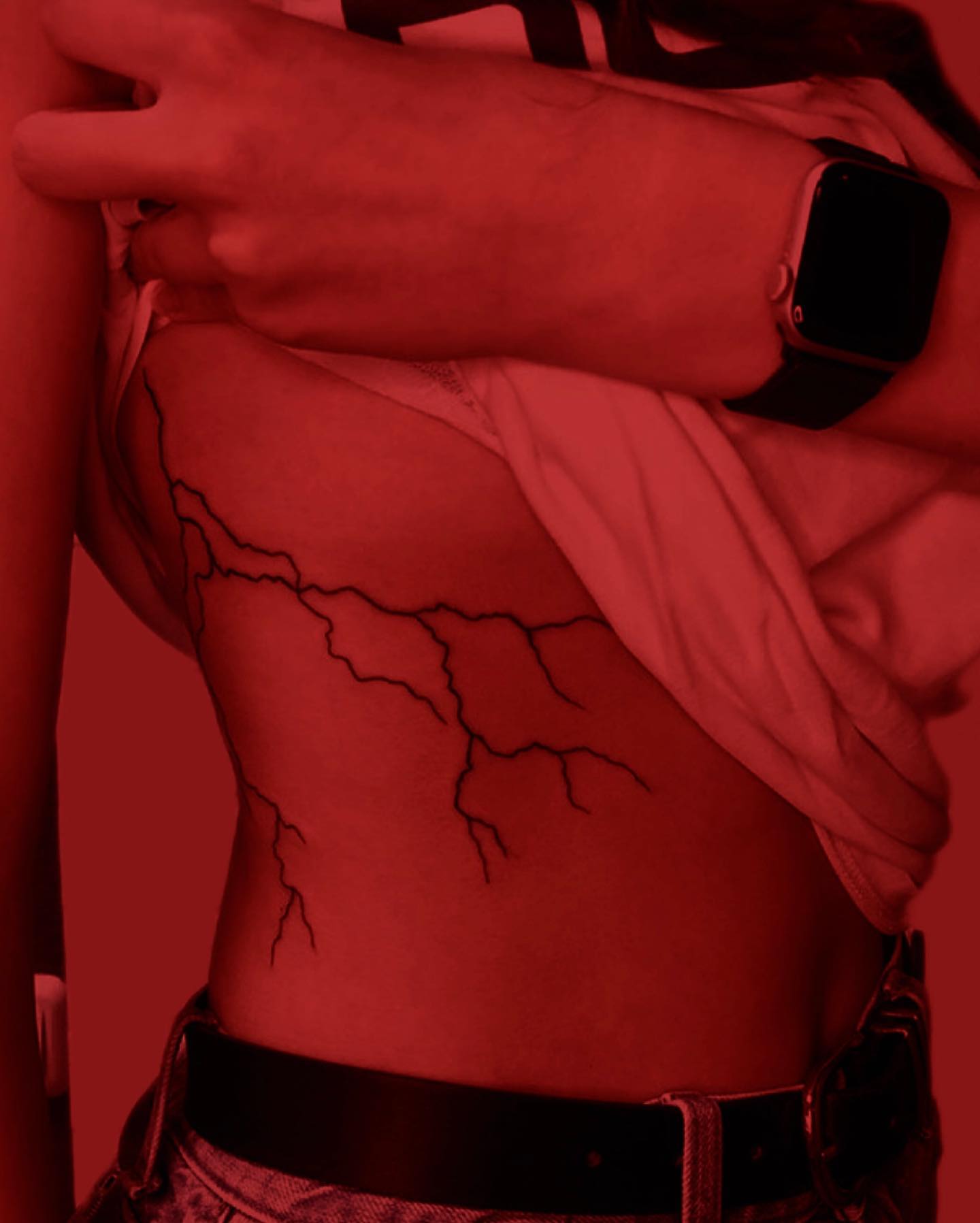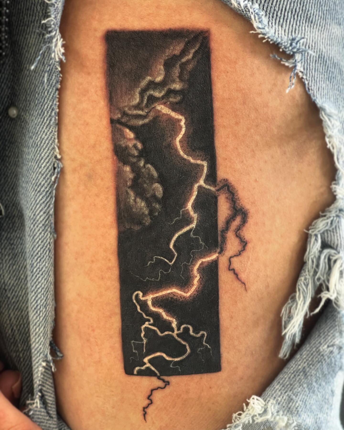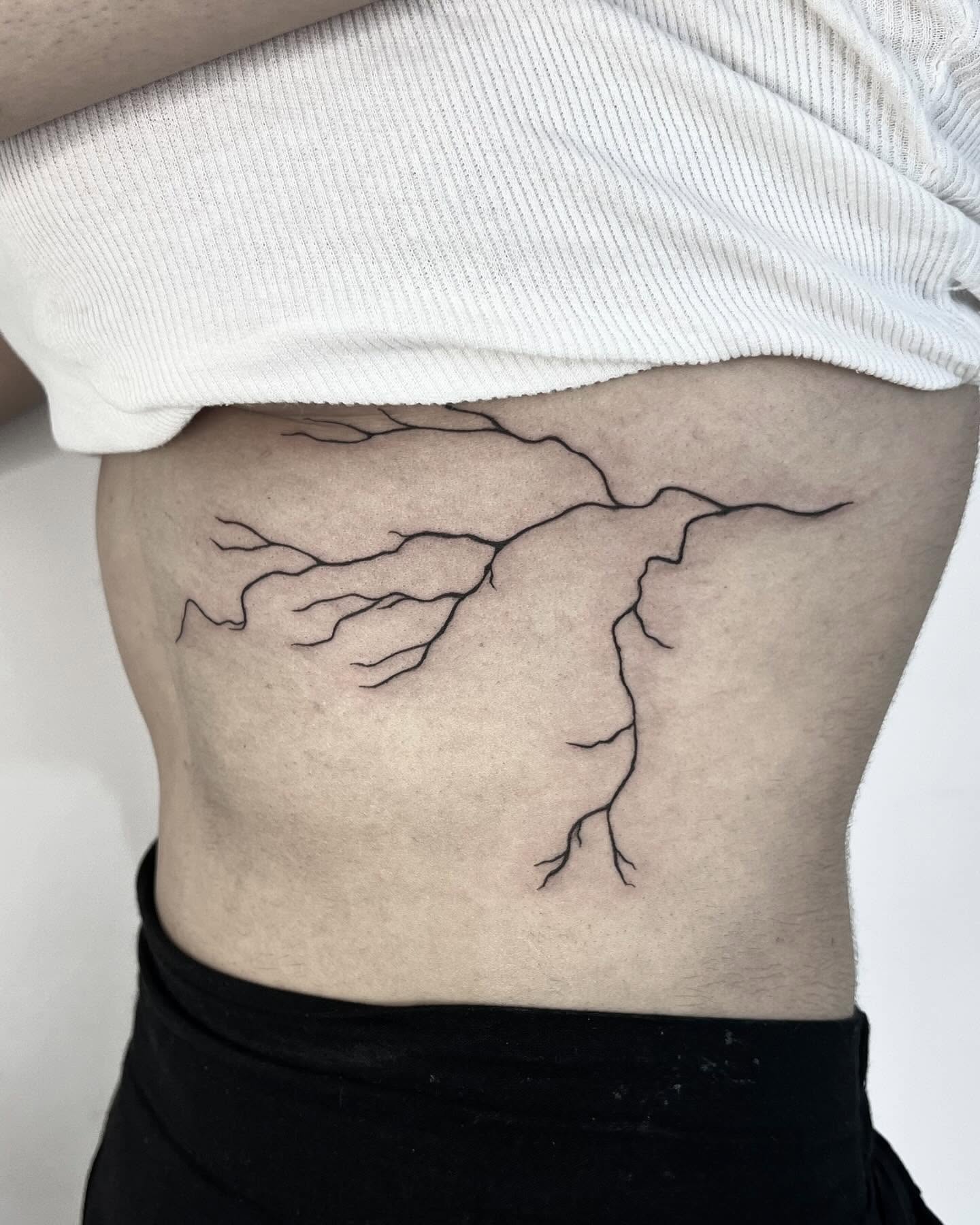 This image showcases a striking lightning bolt tattoo that beautifully wraps around the side of the body. The bold lines and dynamic shape capture the essence of power and energy, making it a stunning expression of individuality. Choosing a tattoo like this can be a memorable way to symbolize strength and resilience in one’s life journey.