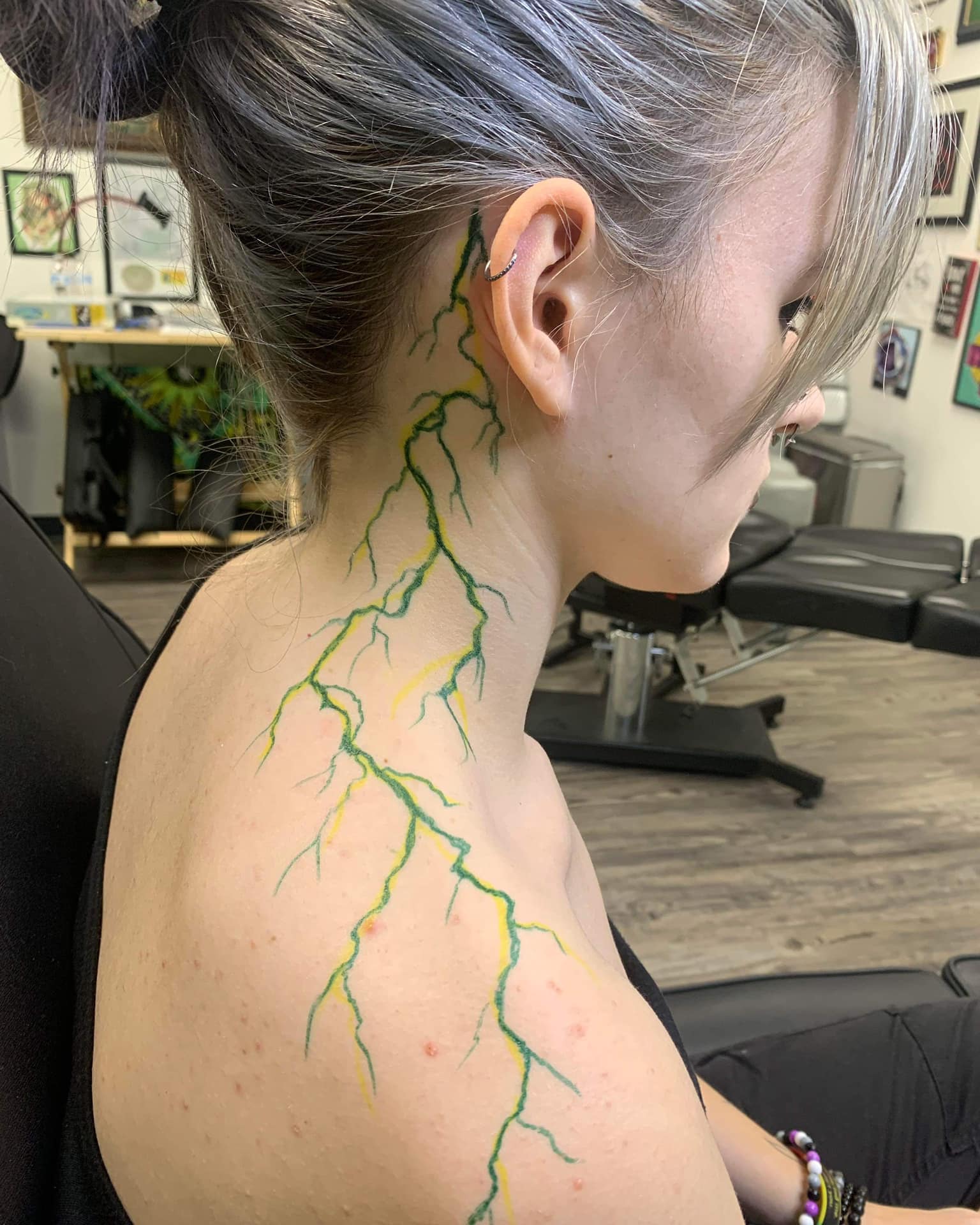This image showcases a striking lightning bolt tattoo that flows gracefully along the neck and shoulder. The vibrant colors of green and yellow make it stand out, creating a mesmerizing effect. For those considering a similar design, think about how the placement can reflect your personality and style.