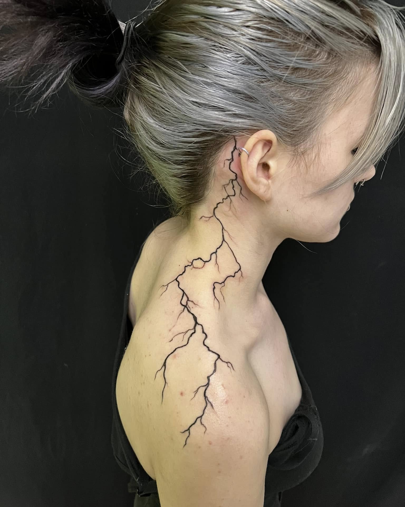 This striking tattoo features intricate lightning bolts that flow elegantly along the neck and shoulder. The sharp lines and bold design create a sense of energy and movement, making it a memorable piece of art. For anyone considering a similar design, choosing a spot that enhances its natural flow can make all the difference in how it stands out.