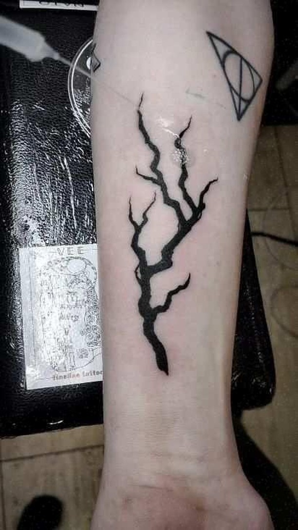 This striking tattoo features a sleek, black lightning bolt that resembles a branch, blending nature and energy beautifully. With its sharp lines and dynamic shape, it captures the viewer’s attention and evokes a sense of power. Choosing a design like this can symbolize strength and individuality, making it a memorable choice for anyone looking to express their unique style.