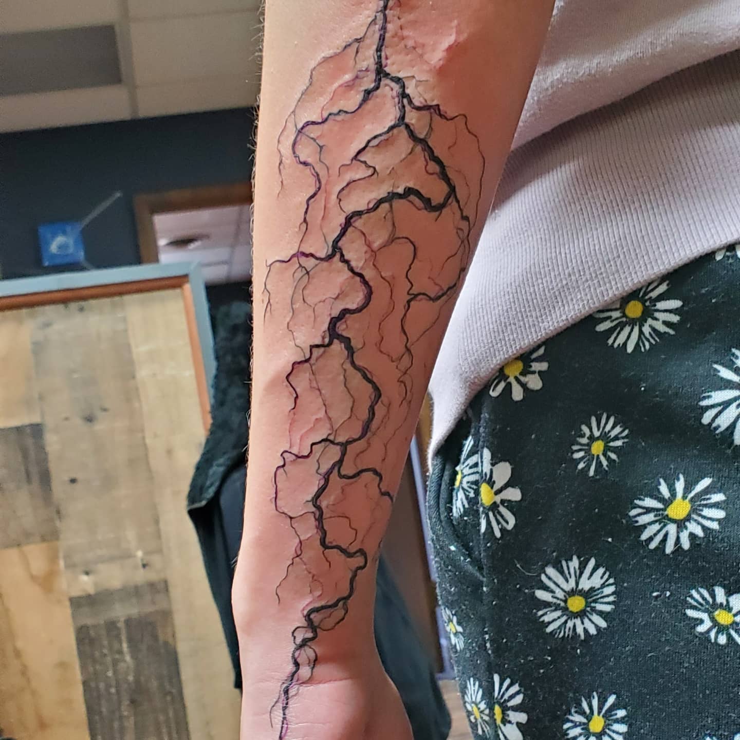 This striking tattoo features bold lightning bolt designs that create a dramatic effect on the skin. The way the cracks intertwine with colorful elements adds an artistic flair, making it a standout choice for those who love unique body art. For those considering a tattoo, choosing a design that resonates personally can make it even more special.