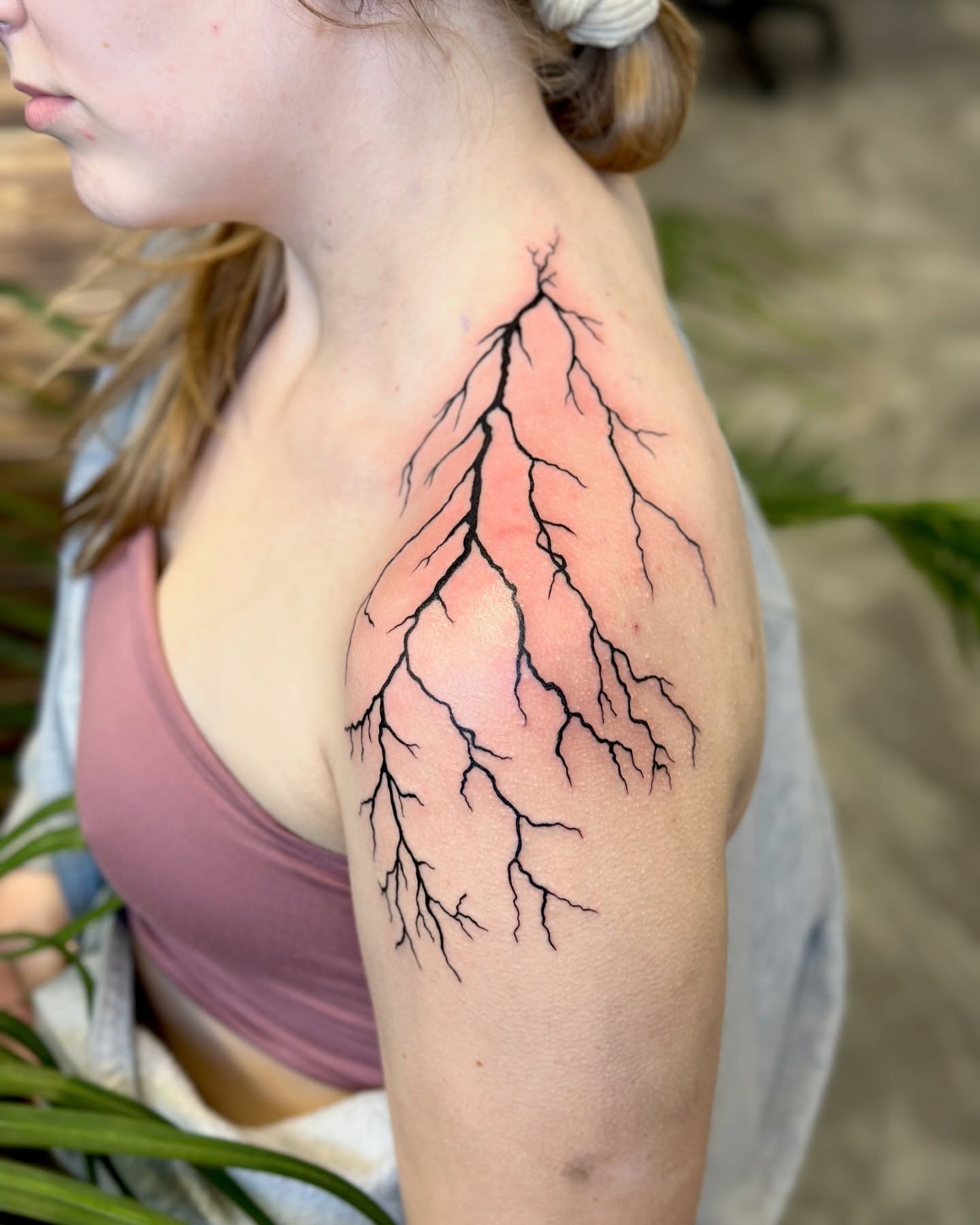 This tattoo showcases a stunning lightning bolt design that flows beautifully across the shoulder. The intricate details of the branches mimic nature’s raw energy, creating an eye-catching piece of art. Choosing a spot like the shoulder allows for a unique display, making it a memorable choice for anyone looking to express their bold personality.