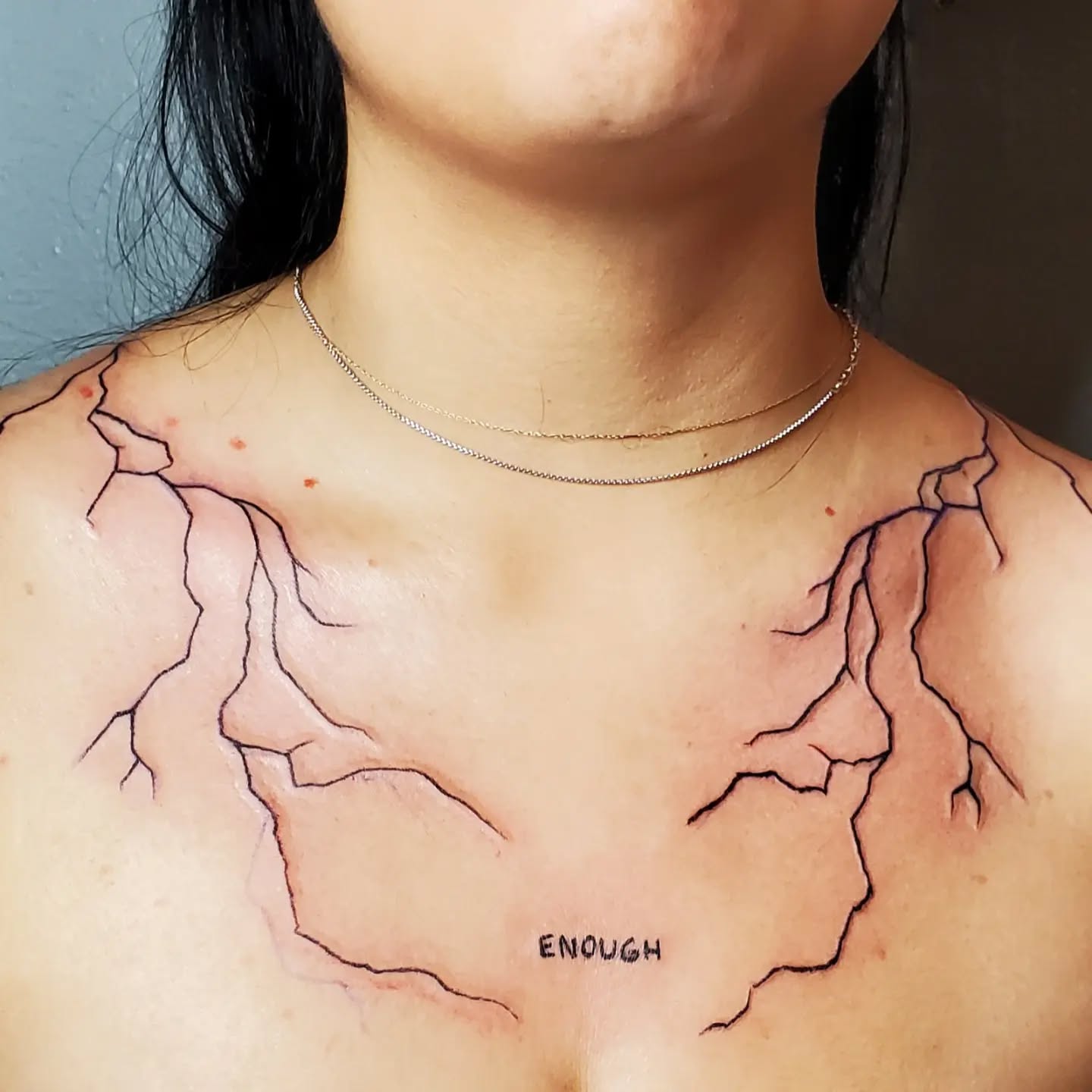 This striking tattoo features intricate lightning bolts sprawling across the chest, creating a bold statement that catches the eye. The word “ENOUGH” nestled between the bolts adds a powerful message, symbolizing strength and resilience. For those considering a lightning bolt tattoo, choosing a personal motto can make the design even more meaningful.