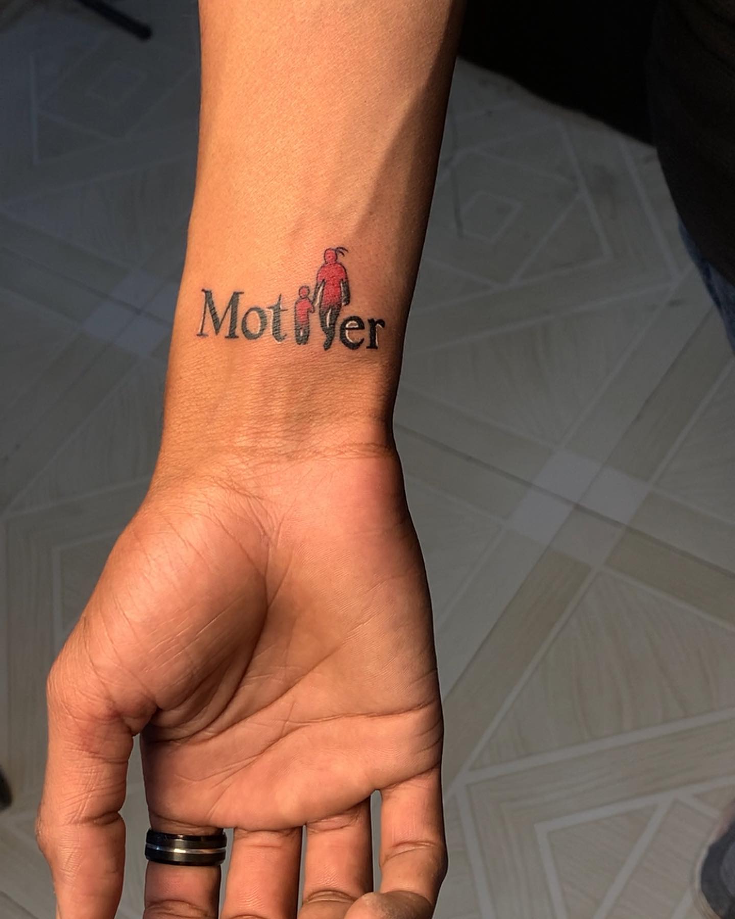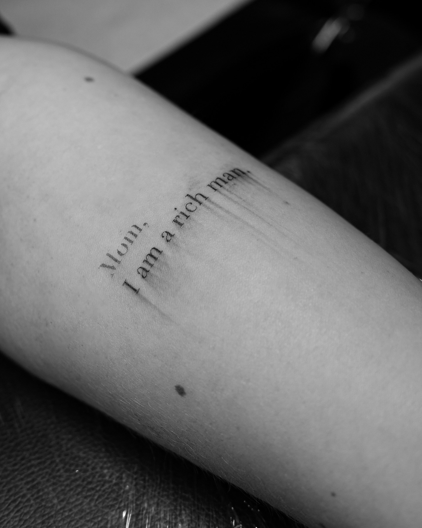 This tattoo features a heartfelt message that reads, “Mum, I am a rich man,” beautifully inked on the arm. It captures the essence of gratitude and love, showcasing how a simple phrase can hold deep meaning. Such personal expressions can inspire others to create their own unique tattoos that honor family bonds and cherished memories.