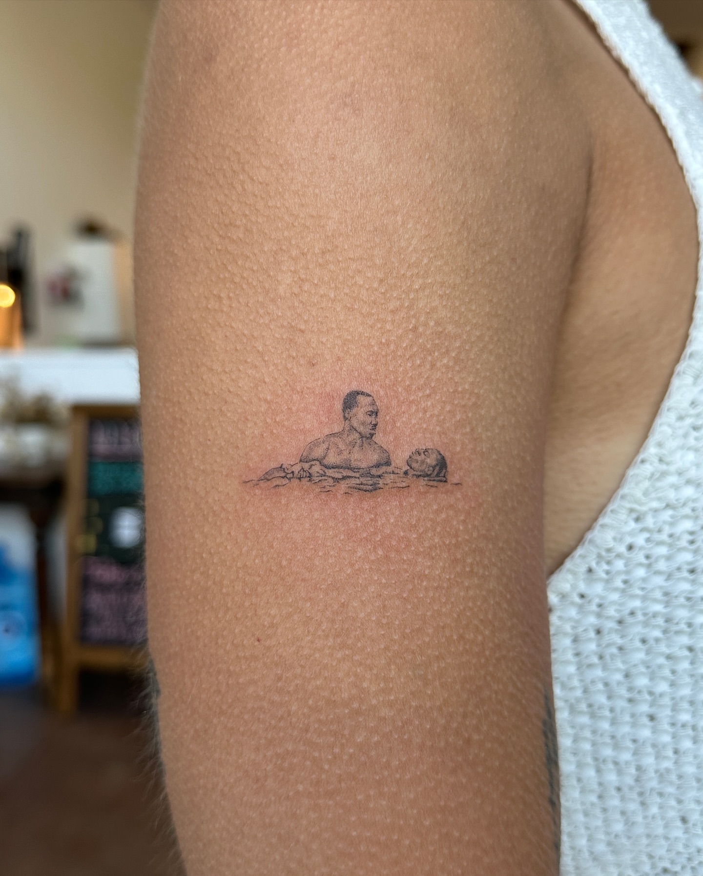 This tattoo beautifully captures a touching moment between two people, showing a swimmer and someone in the water, creating a sense of connection and intimacy. The delicate details bring the scene to life, making it feel almost like a snapshot of a cherished memory. Choosing a tattoo that represents special moments can be a meaningful way for parents to celebrate their journey together.