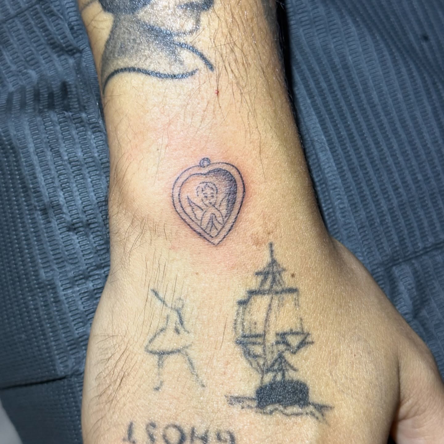 This charming heart-shaped tattoo holds a special place on the wrist, symbolizing love and connection. The delicate design features a figure inside the heart, evoking a sense of nostalgia and warmth. For parents considering a tattoo, choosing a meaningful symbol can create a lasting bond and tell a beautiful story.