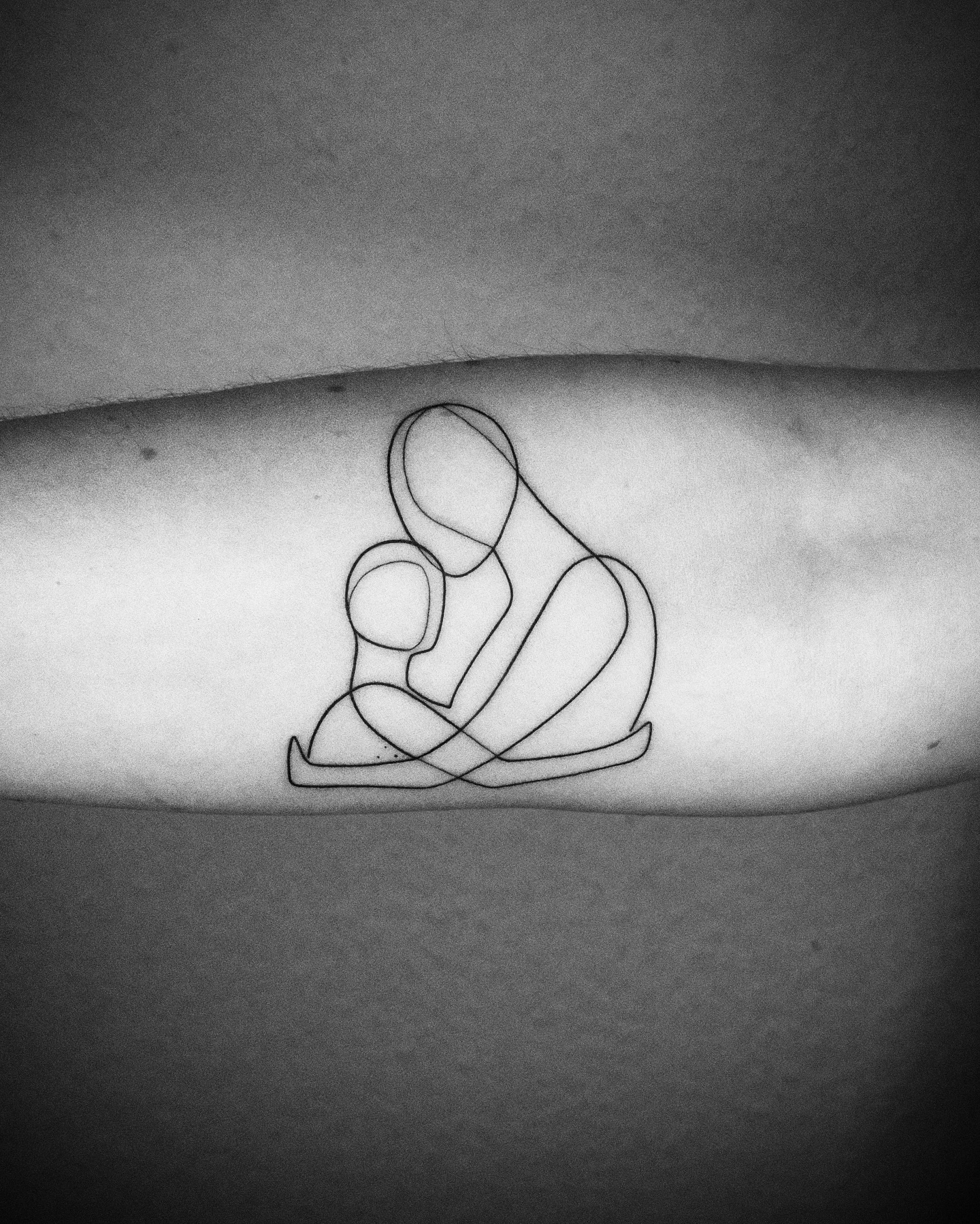 This striking tattoo beautifully captures the bond between a parent and child, showcasing their embrace in a minimalistic design. The flowing lines create a sense of warmth and love, making it a perfect tribute for anyone wanting to honor their family. When considering tattoos for parents, choosing a design that reflects shared moments can make it even more meaningful.