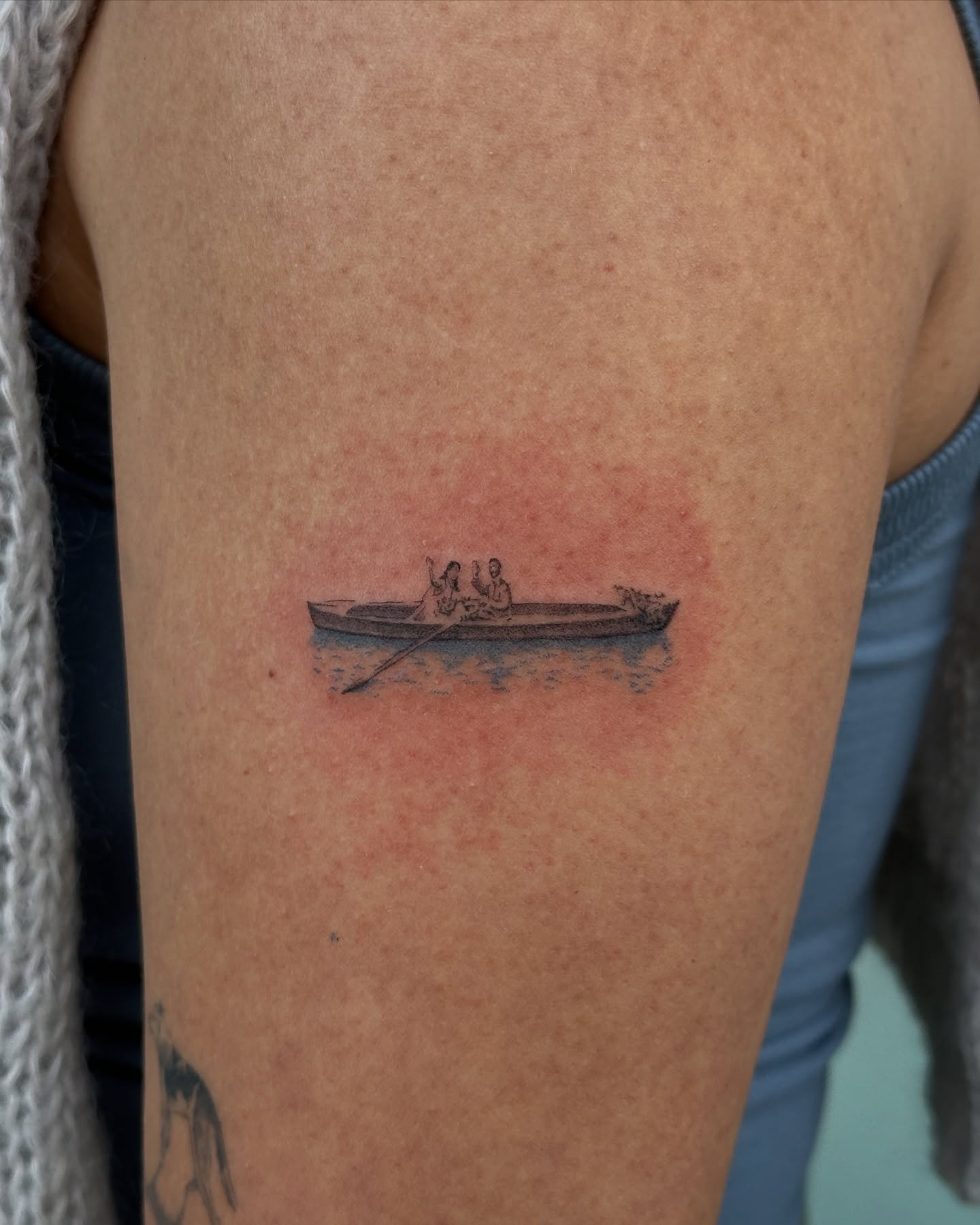 This tattoo beautifully captures a serene moment of two people in a boat, evoking feelings of adventure and togetherness. It reminds viewers of the simple joys in life, like spending time with loved ones on a peaceful lake. For those considering a tribute to special memories, this could inspire a unique design that honors cherished experiences with family.