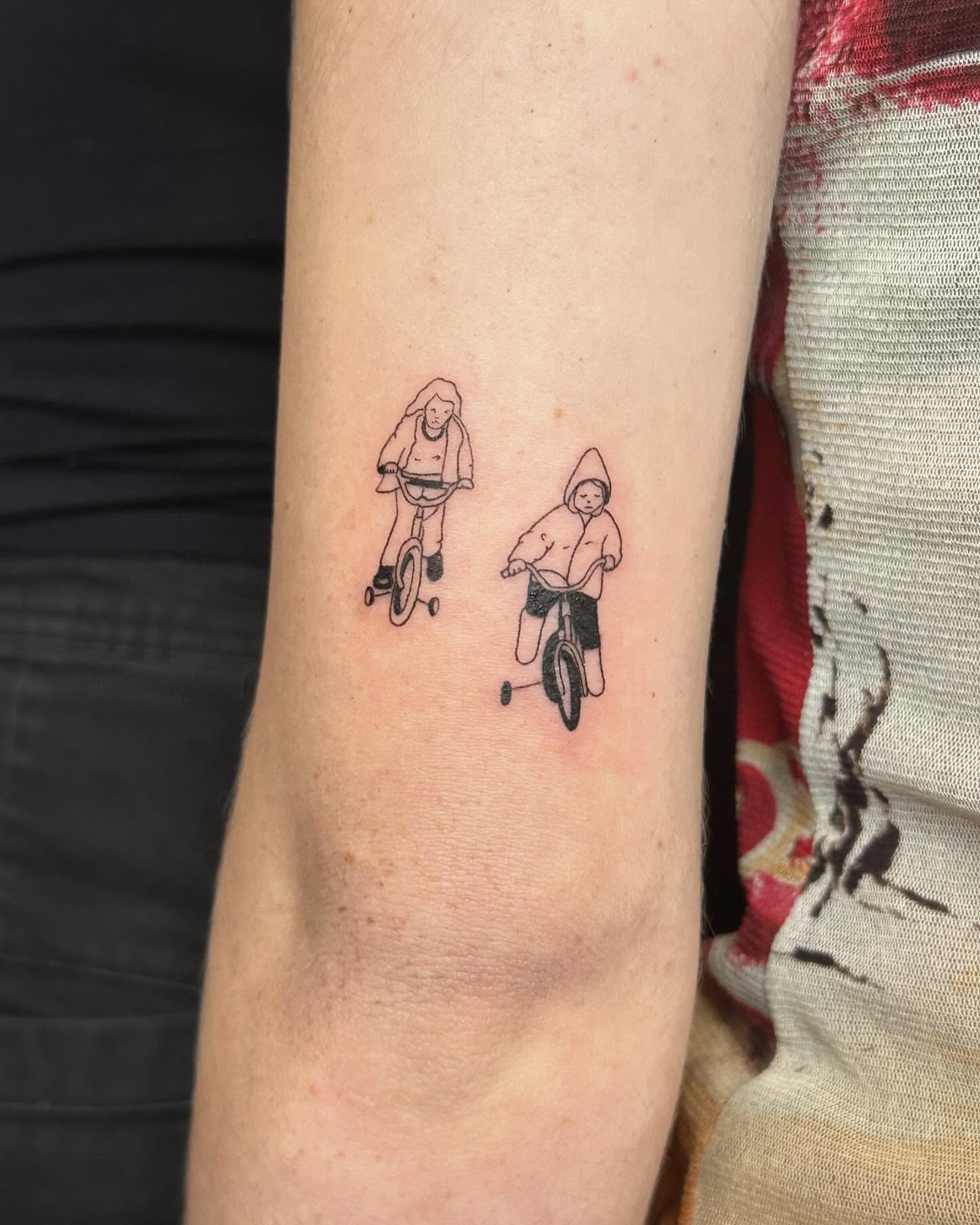 This delightful tattoo captures the joy of childhood, featuring two kids riding bikes, each lost in their own world of fun. It evokes memories of carefree days spent outdoors, reminding parents of the simple pleasures of youth. A great tip for anyone considering a similar tattoo is to choose a design that reflects personal memories, making it even more meaningful.