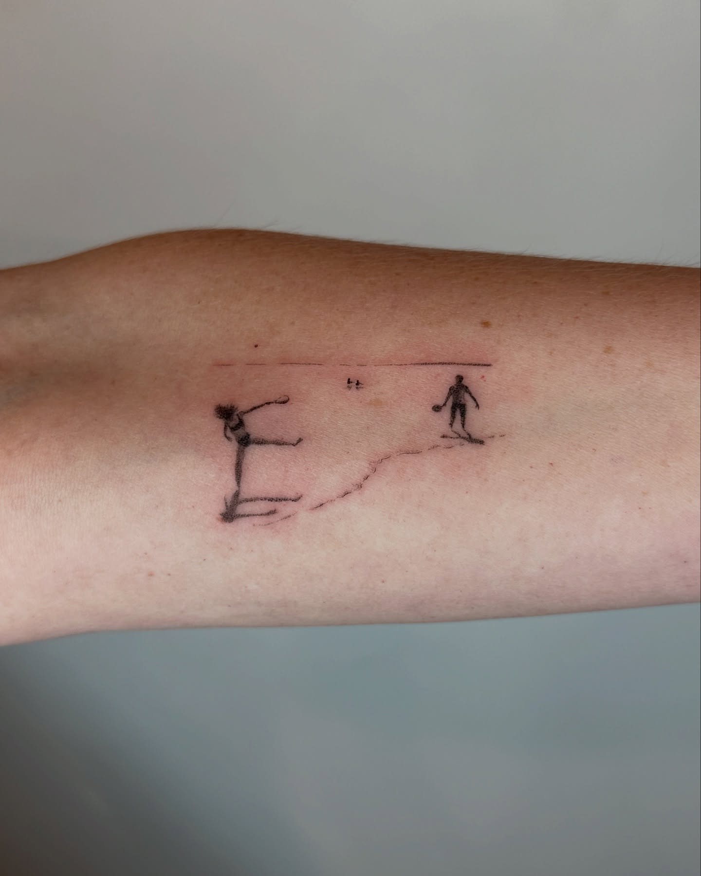 This tattoo features a playful scene of two figures engaged in a game, capturing the joy of movement and teamwork. The minimalist design adds a unique touch, making it a perfect conversation starter. For parents considering a tattoo, choosing a design that reflects cherished memories can be a beautiful way to celebrate family connections.