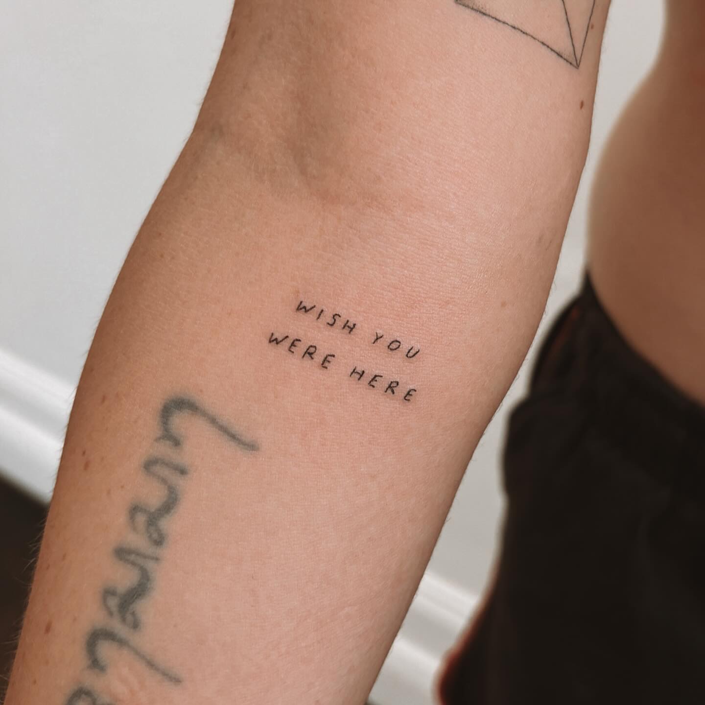 This image showcases a simple yet heartfelt tattoo that reads “WISH YOU WERE HERE.” It beautifully captures the essence of connection and longing, making it a perfect tribute for someone special. For those considering a tattoo, think about words or phrases that hold deep meaning for you or your loved ones; it can be a delightful way to celebrate relationships.