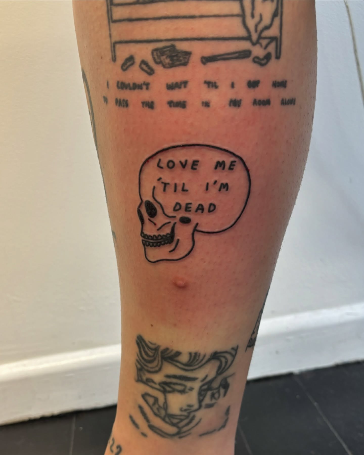 This image showcases a striking tattoo featuring a skull with the phrase “Love me ’til I’m dead.” The bold design captures a mix of humor and deep affection, making it a conversation starter for anyone who sees it. Tattoos like this can remind parents of the powerful messages art can convey, making them a unique way to express enduring love and connection.