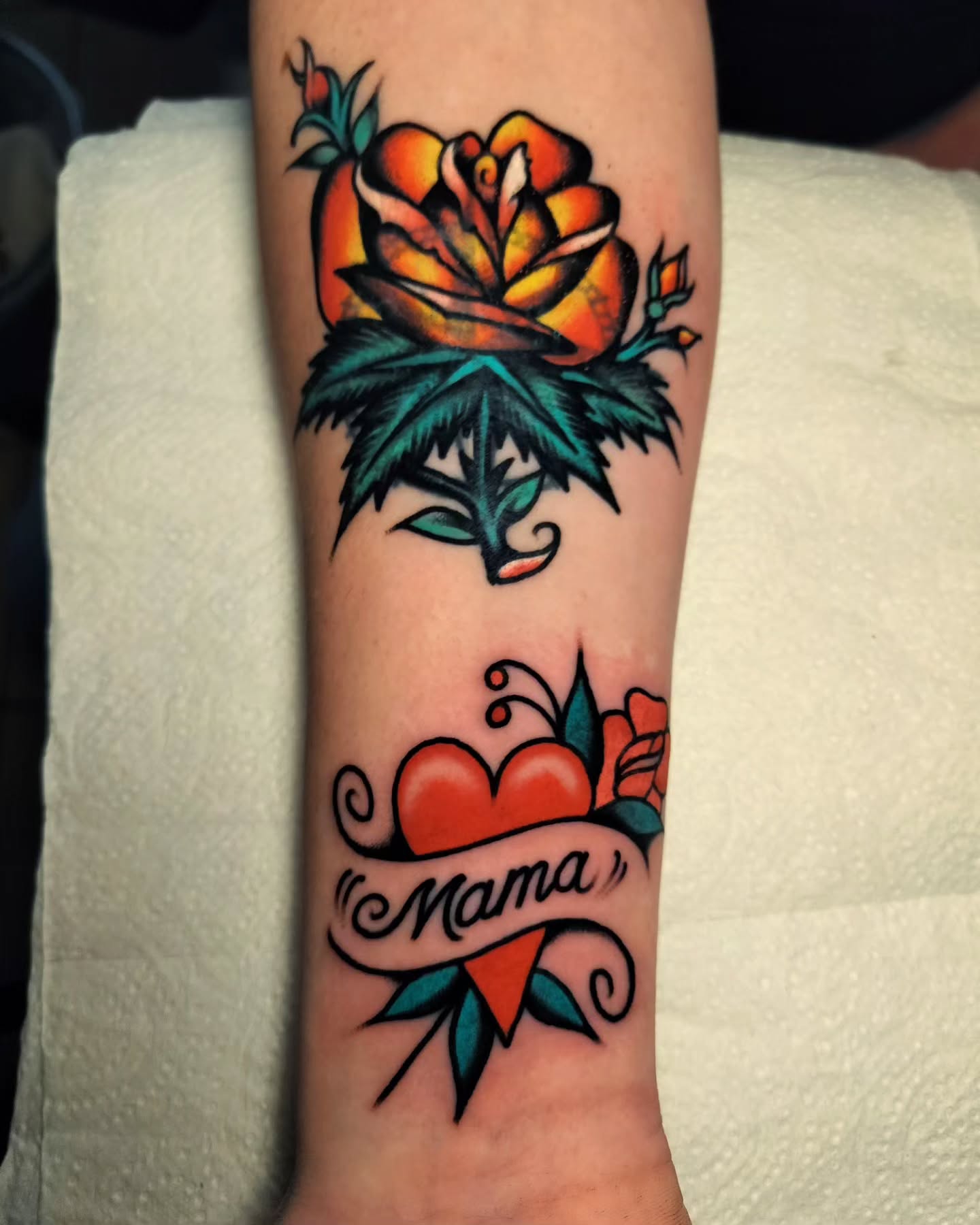 This vibrant tattoo features a stunning rose alongside a heartfelt tribute to “Mama,” showcasing a blend of artistry and emotion. The bold colors and intricate details make it not just a piece of art, but a lovely reminder of the bond between a child and their mother. For those considering a tattoo for their parents, choosing a design that reflects personal memories can create a truly meaningful tribute.