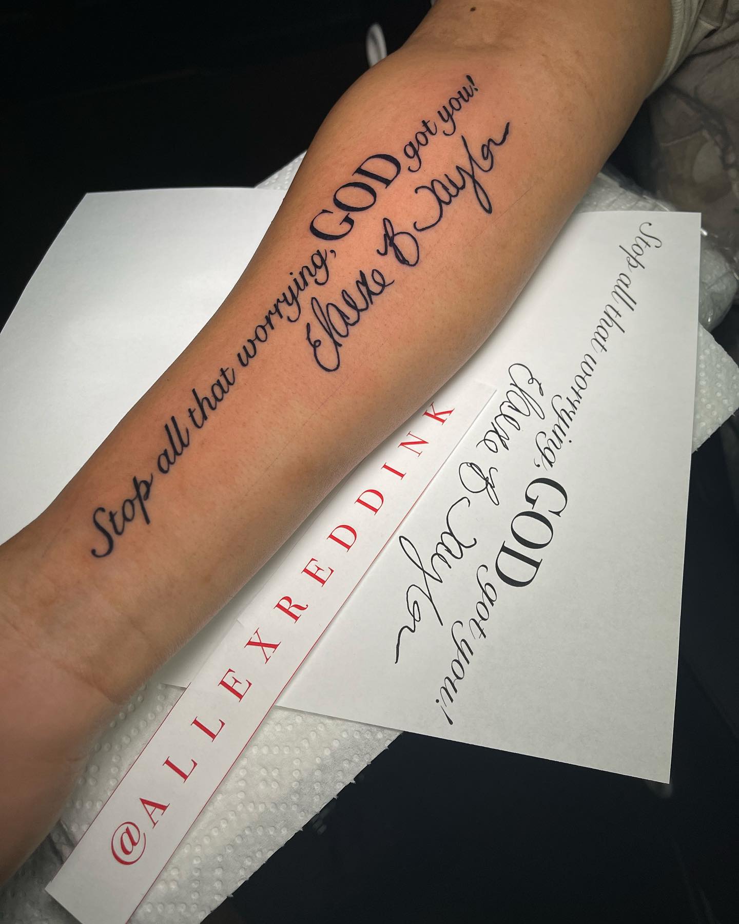 This striking tattoo features a powerful message that encourages positivity and faith. The elegant script reads, âStop all that worrying; GOD got you!â reminding viewers to let go of their concerns. Such meaningful tattoos can serve as daily motivation for anyone, including parents who might appreciate a gentle reminder of hope in their lives.