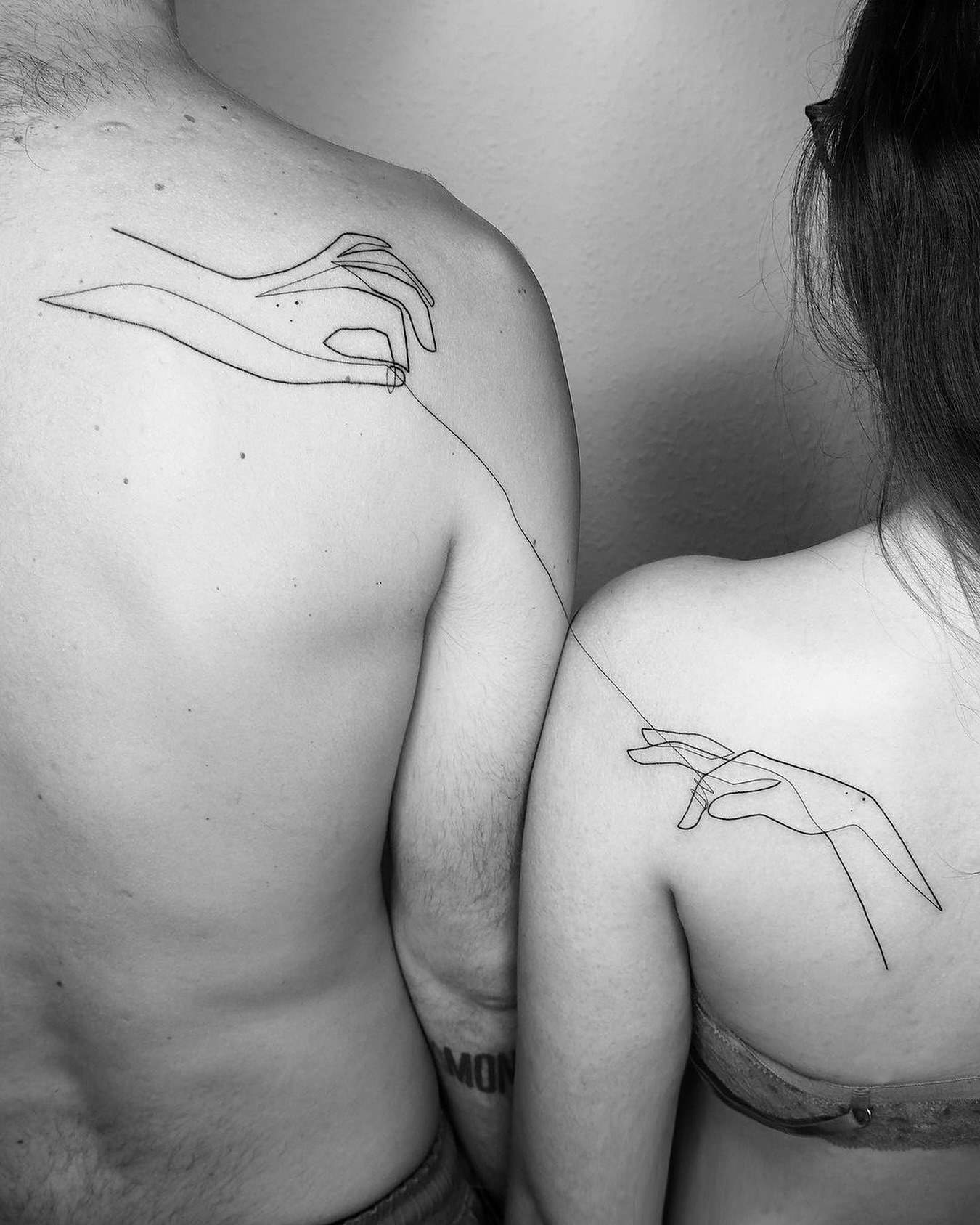 This image showcases a beautiful tattoo design that features two hands reaching toward each other, symbolizing connection and love. The simple yet elegant lines create a striking visual that speaks to the bond between two people. For parents considering a meaningful tattoo, this design could represent their unique relationship and shared journey through life.