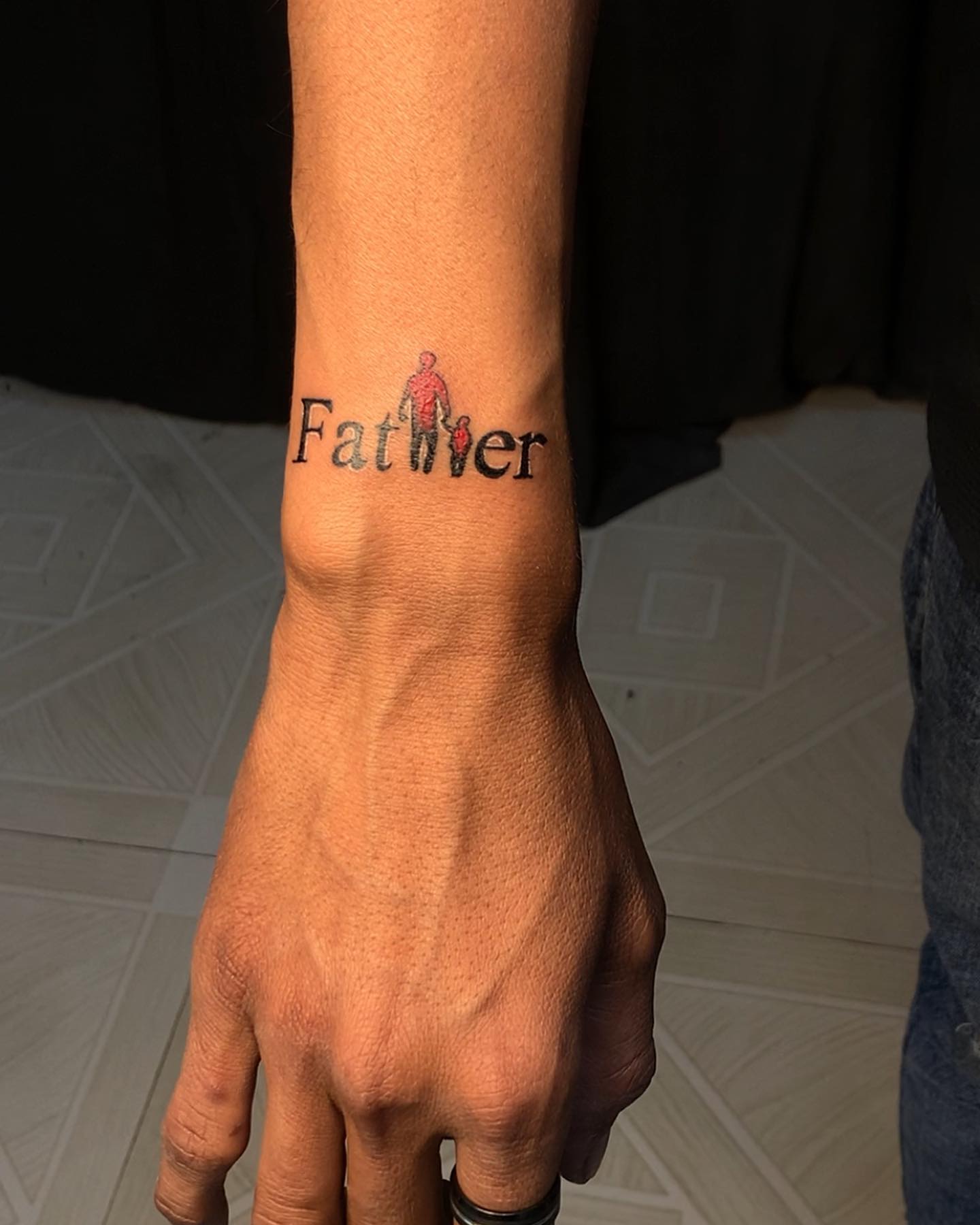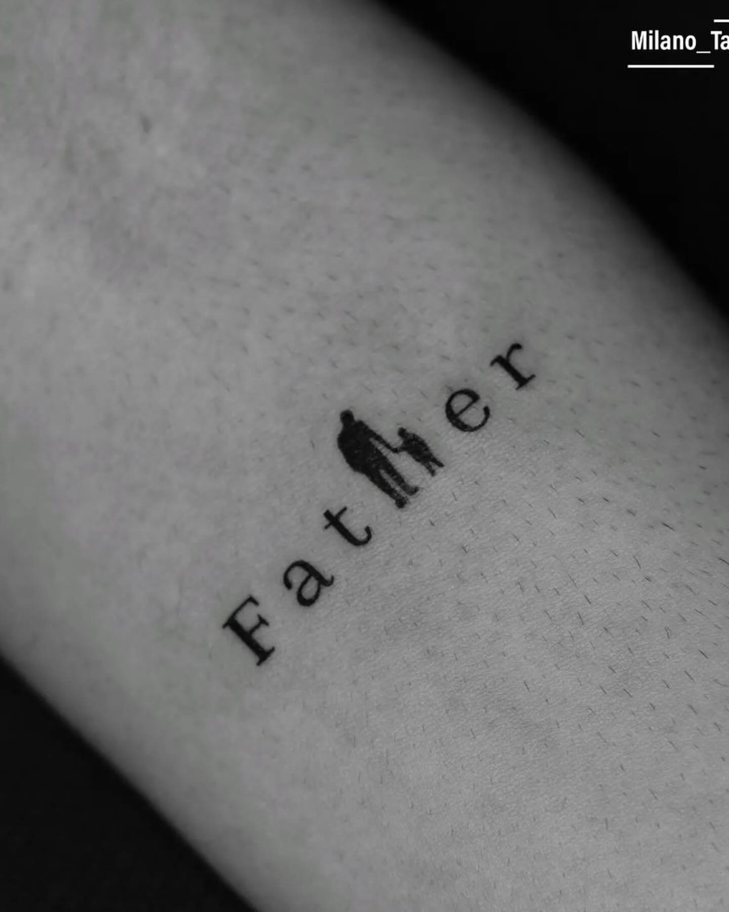 This tattoo beautifully combines the word “Father” with a touching silhouette of a father and child, creating a powerful reminder of their bond. It’s a heartfelt way to celebrate the love and guidance that fathers provide. For anyone considering a tribute tattoo, choosing a design that reflects personal memories can make it even more special.