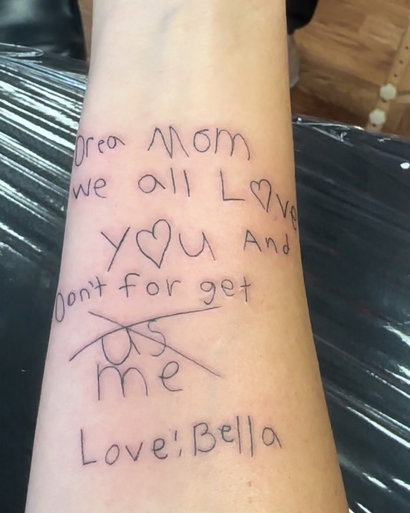 This heartfelt tattoo showcases a beautiful message that truly captures the love between a child and their mom. The handwritten style adds a personal touch, making it even more special. For anyone considering a meaningful tattoo for their parents, a simple message like this can express deep feelings in a unique way.