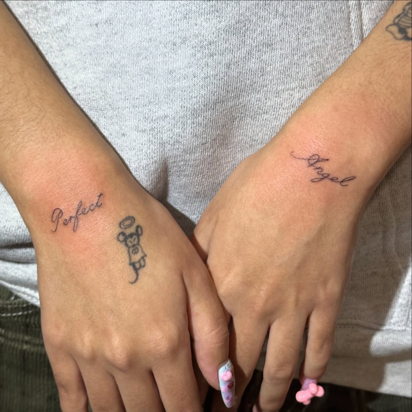 This image showcases two heartfelt tattoos that beautifully convey deep emotions. One wrist features the word “Perfect,” while the other displays “Angel,” each with a unique design that tells a story of affection. Tattoos like these can be a lovely way for parents to celebrate their bond and express their feelings for one another, reminding them of the special moments they’ve shared.