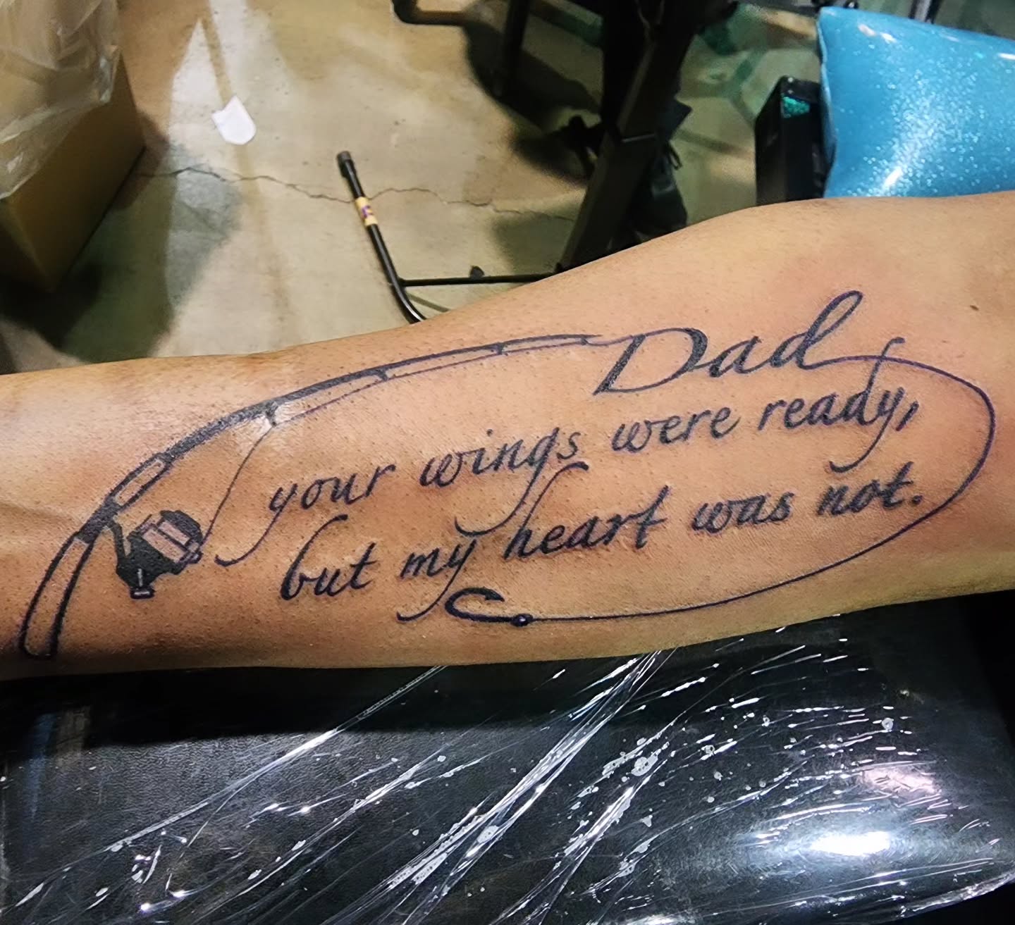 This tattoo beautifully honors a father with heartfelt words that express both love and loss. The phrase, “Dad, your wings were ready, but my heart was not,” captures a deep emotional connection, making it a powerful tribute. For those considering a meaningful tattoo for their parents, choosing a personal message can create a lasting way to celebrate their memory.