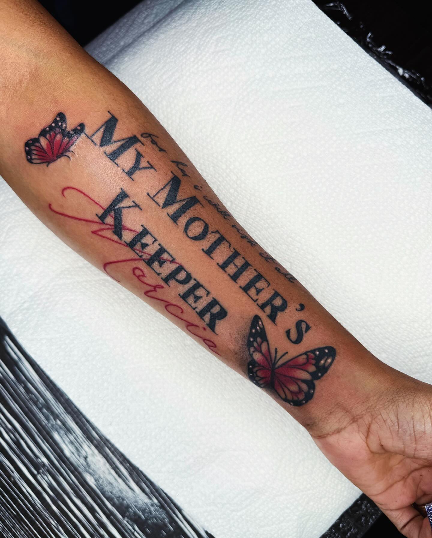 This stunning tattoo beautifully combines heartfelt words with vibrant butterfly designs, creating a lasting tribute to a cherished mother. The phrase “My Mother’s Keeper” shows deep love and commitment, making it a perfect choice for anyone wanting to honor their mother in a unique way. Remember, choosing a tattoo that tells a personal story can make it even more special.
