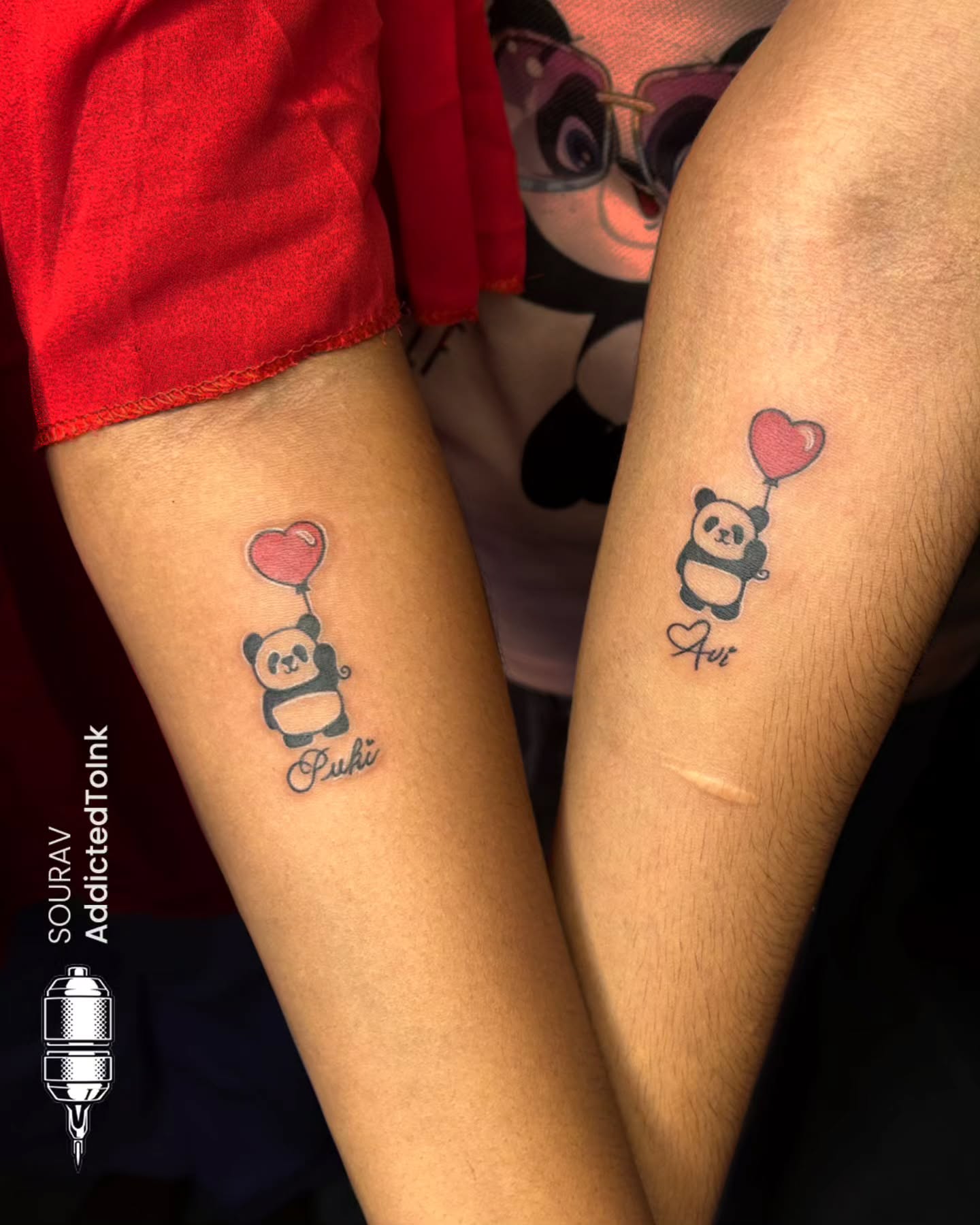 This image features adorable panda tattoos, each holding a heart-shaped balloon, making them a delightful symbol of love and connection. The names “Suki” and “Avi” add a personal touch, showcasing a bond between the wearers. These charming designs are perfect for parents who want a meaningful way to celebrate their relationship with their children or each other.