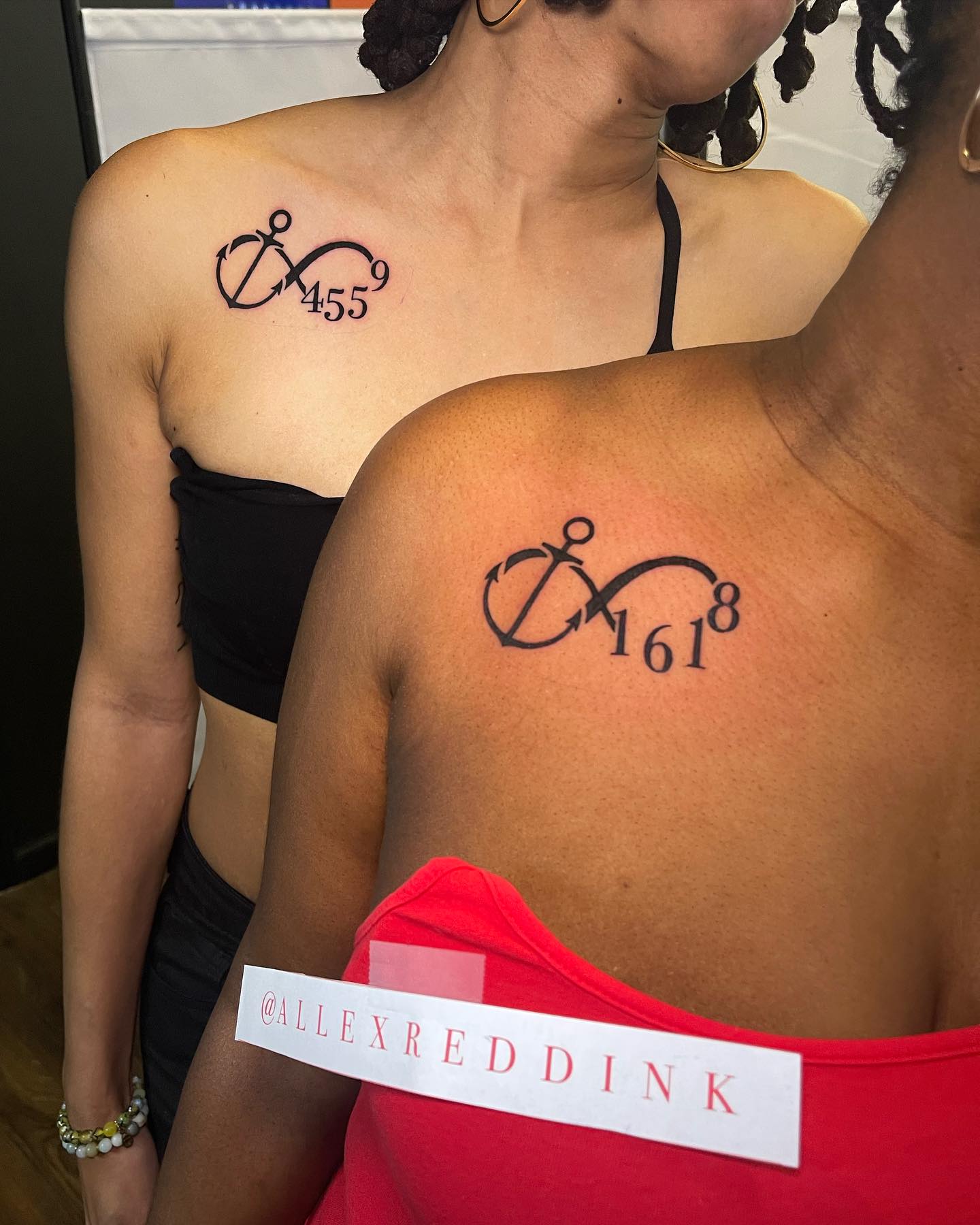 This image showcases two sisters proudly displaying matching tattoos, each adorned with unique symbols and numbers. The intricate design blends anchors with infinity signs, representing their unbreakable bond and shared adventures. For parents considering a meaningful tattoo, matching designs can be a lovely way to celebrate family connections.
