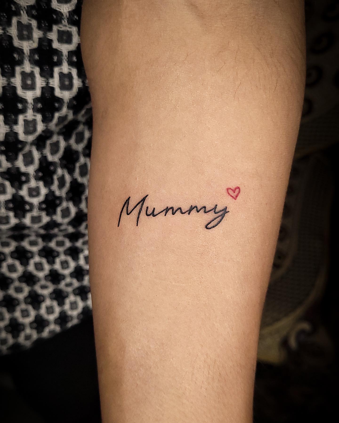 This image showcases a beautiful tattoo that simply reads “Mummy” accompanied by a small heart. It highlights the special bond between a child and their mother, reminding everyone of the love that family provides. A heartfelt tattoo like this can serve as a lovely way for someone to express their appreciation for their parents in a permanent and meaningful way.