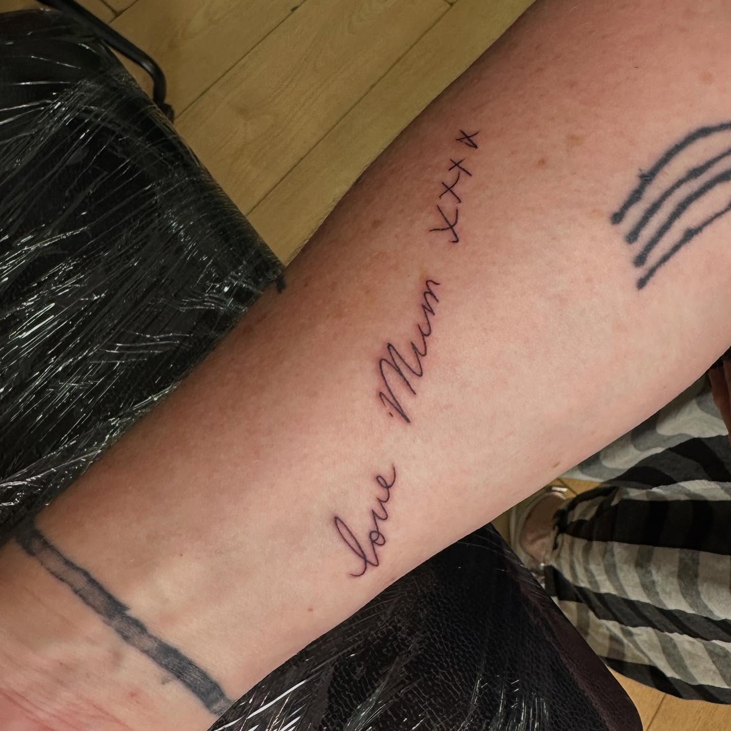 This image showcases a beautifully inked tattoo that reads “love Mum,” capturing a heartfelt message that many can relate to. Tattoos like this serve as a permanent reminder of the bond between a child and their parent, making them a meaningful choice for those looking to honor their family. When considering a tattoo for a loved one, think about personal messages or symbols that hold special significance.