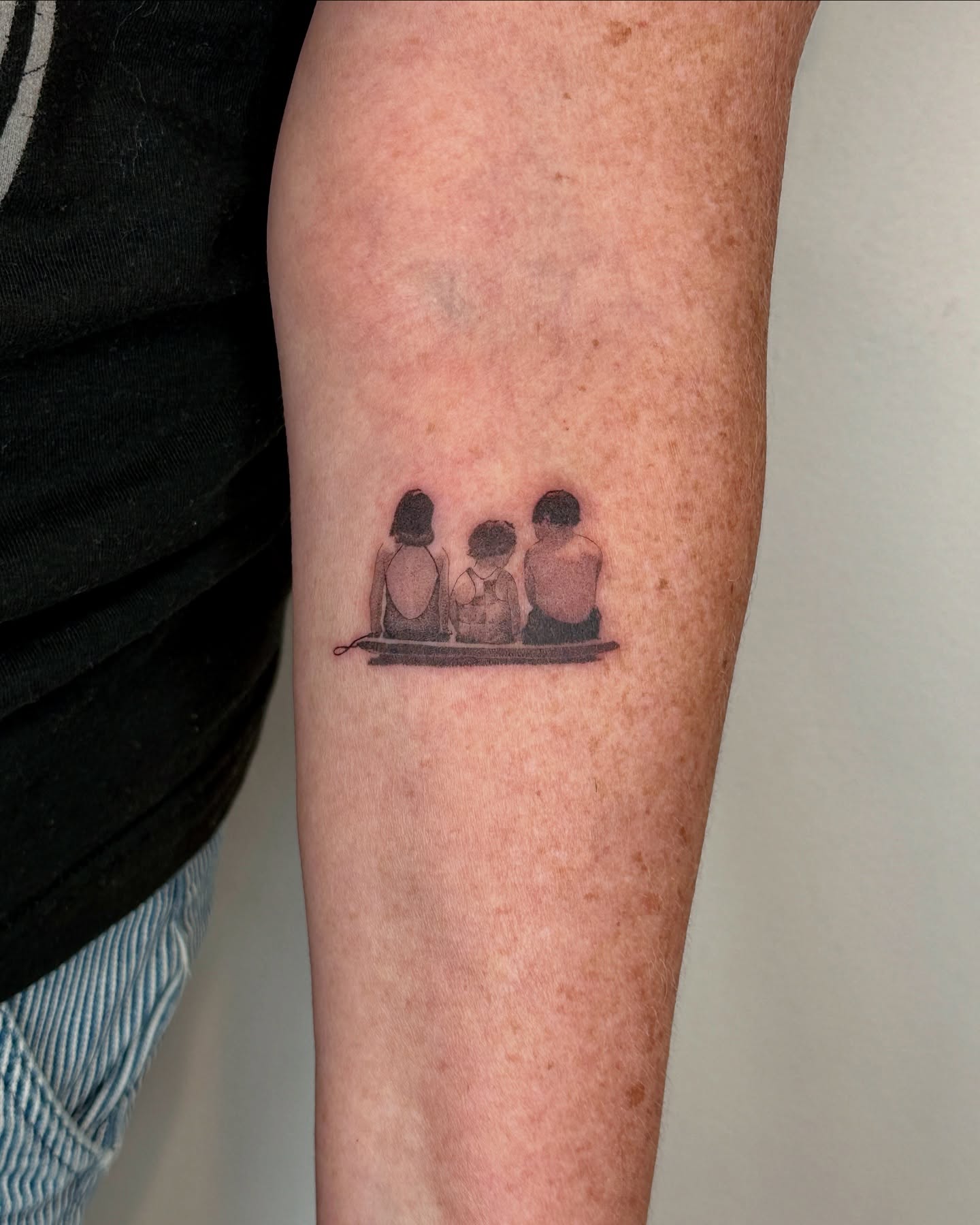 This tattoo beautifully captures a moment of togetherness among three figures, evoking a sense of nostalgia and warmth. It serves as a reminder of cherished family connections, making it a perfect tribute for parents who value their relationships. Choosing a design that represents loved ones can turn a tattoo into a lasting symbol of love and unity.