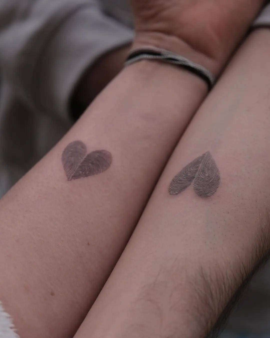 This image showcases two arms adorned with unique heart tattoos, each reflecting a special connection. The designs, resembling fingerprints, symbolize a bond that is both personal and touching. Choosing a meaningful tattoo like this can be a beautiful way for parents to celebrate their love and family ties.