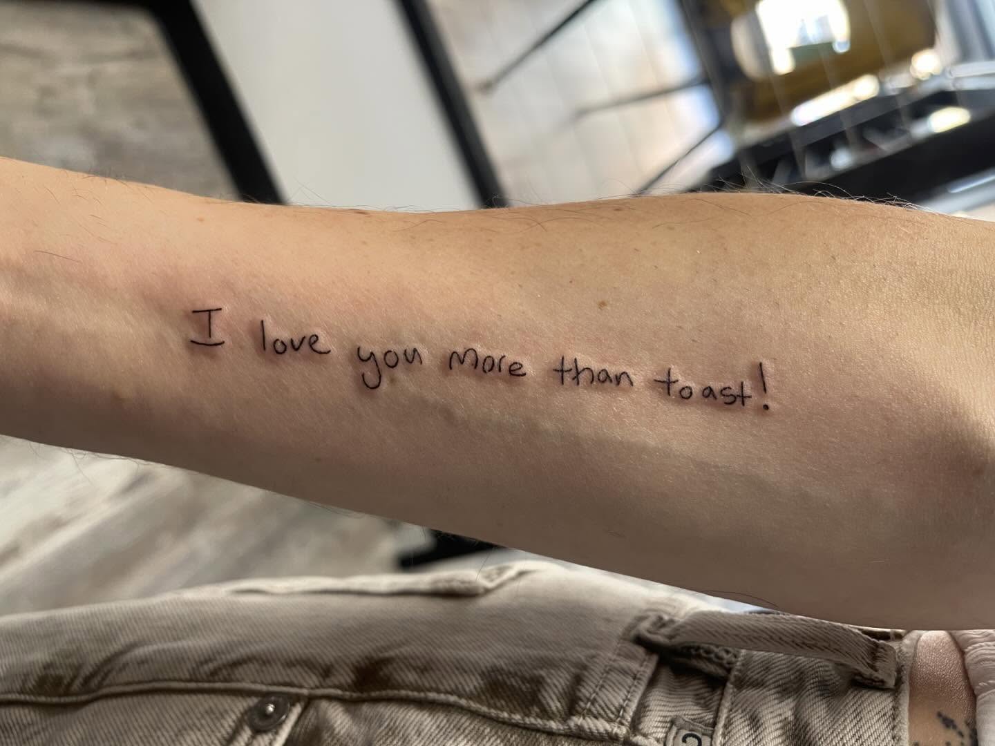 This tattoo features a playful phrase: “I love you more than toast!” It captures a lighthearted expression of love that can bring smiles to anyone who sees it. A fun idea for parents is to consider a tattoo that reflects their unique bond, showcasing humor and warmth in one simple design.