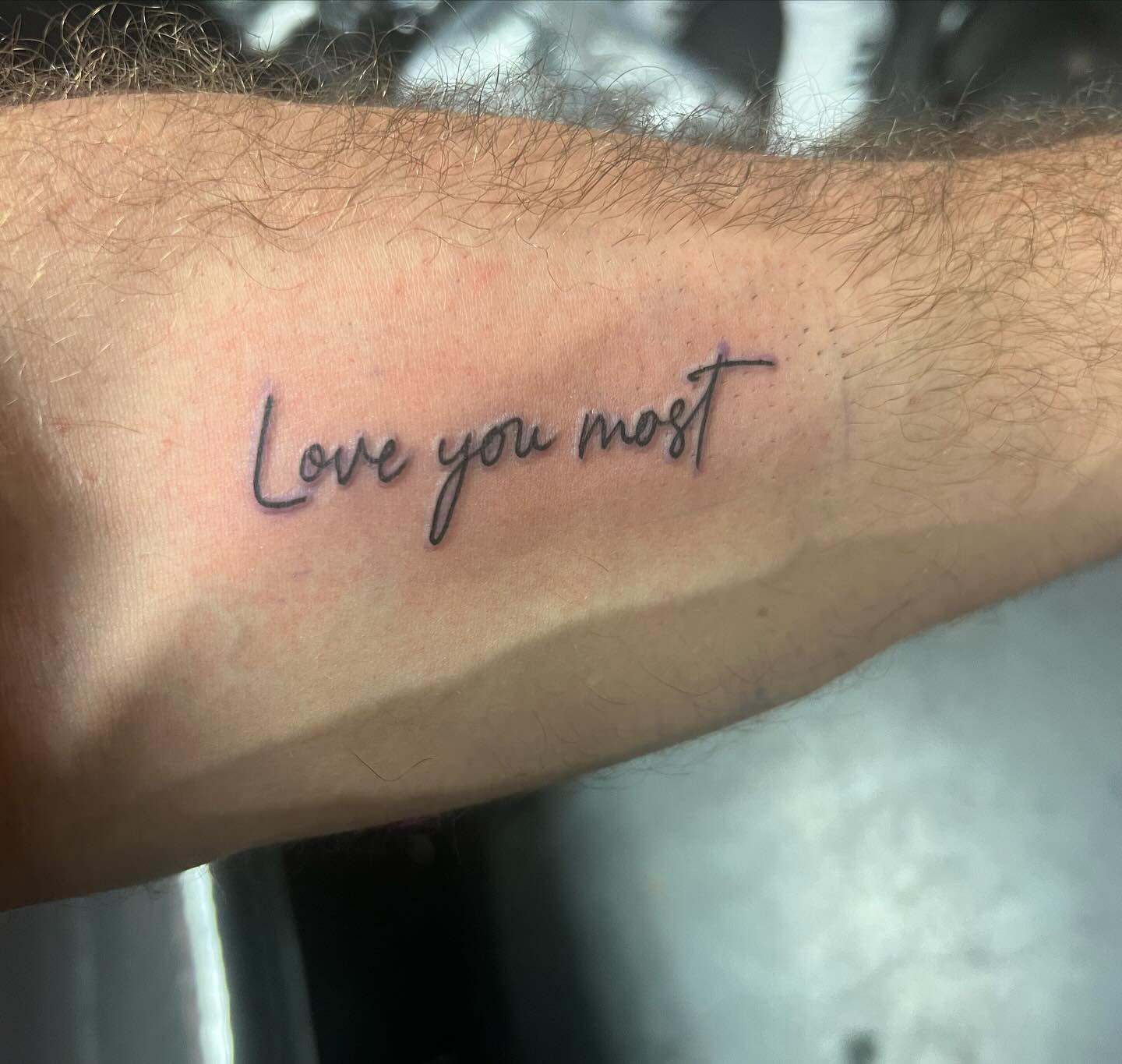 This tattoo features the heartfelt phrase “Love you most,” beautifully scripted on the arm. It’s a simple yet powerful way to express deep emotions, making it a perfect tribute for someone special, like parents. A thoughtful reminder of love, this design shows how tattoos can carry personal meaning and connection.