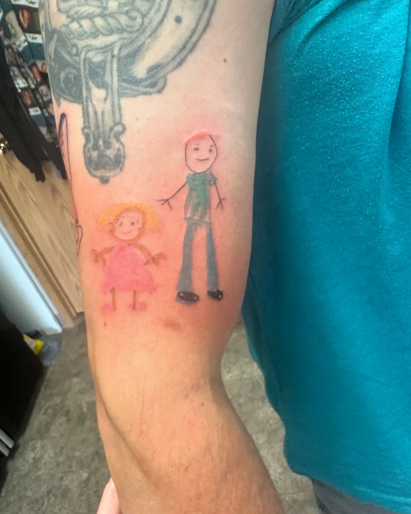 This tattoo features charming stick figures that capture the essence of childhood creativity. It serves as a heartfelt reminder of family moments, making it a unique way to celebrate loved ones. For parents considering a tattoo, personal designs like this can be a beautiful tribute to their children’s artwork.